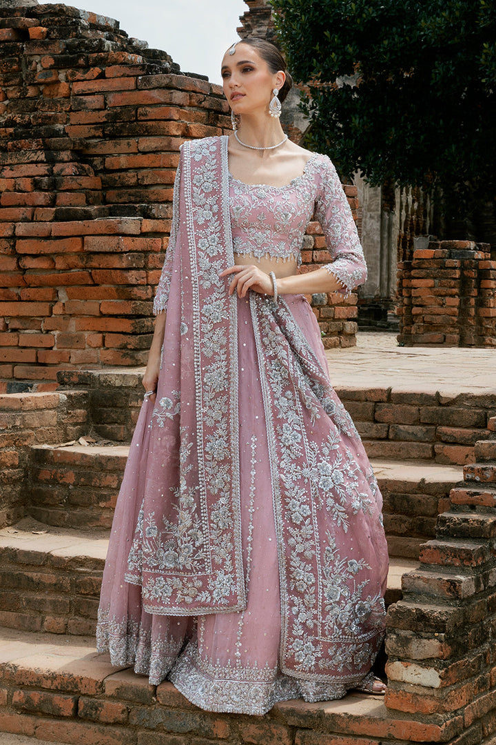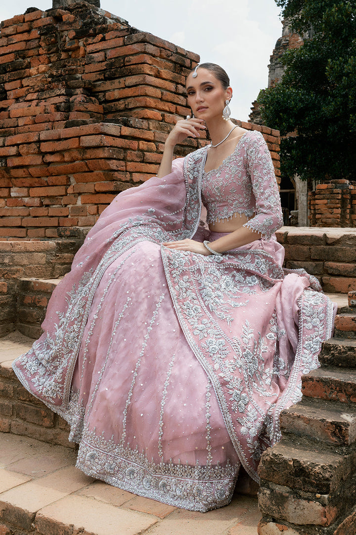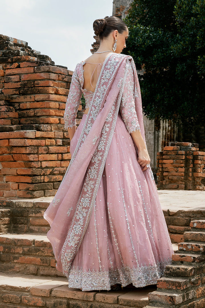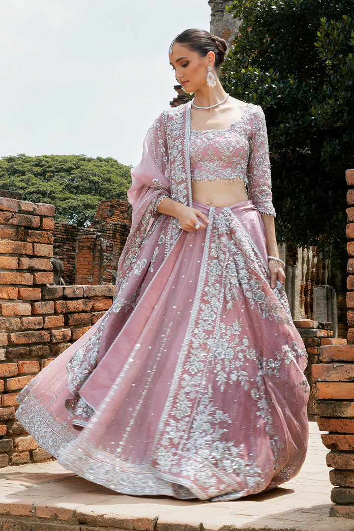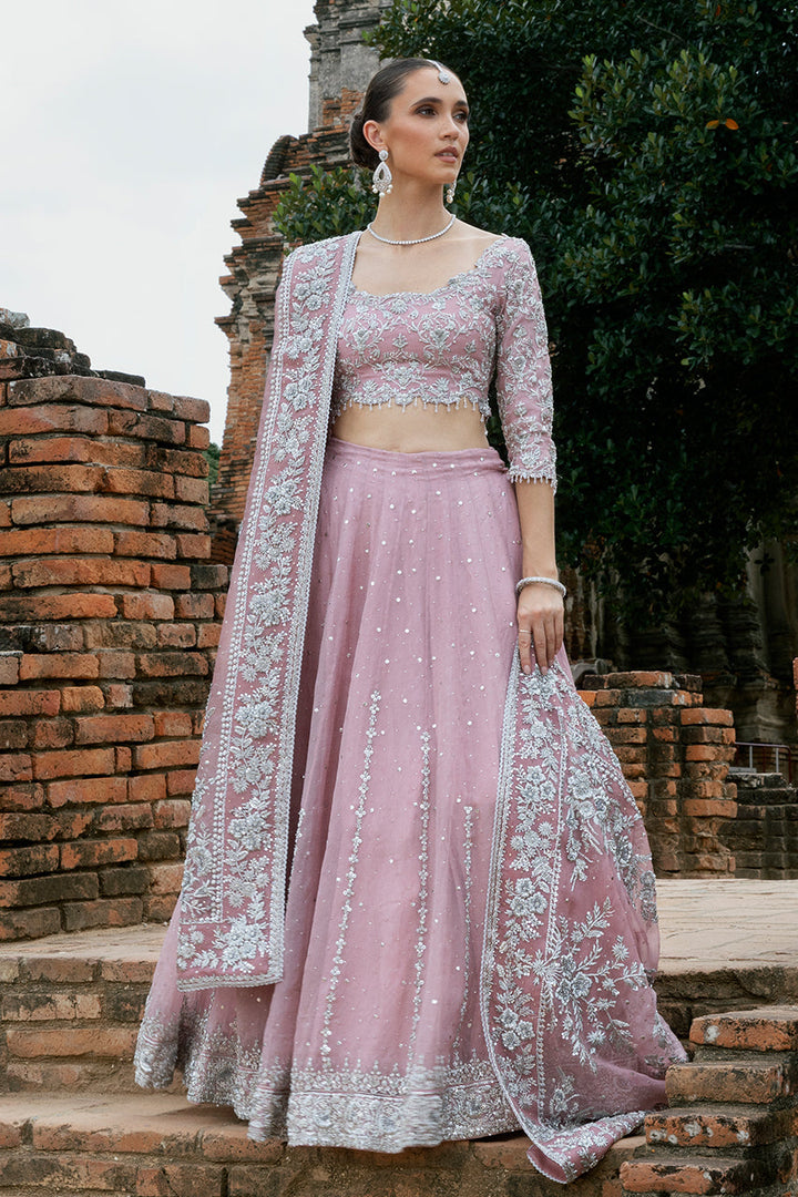 A showcase of meticulous handwork on blush pink organza, this ensemble centers on a blouse entirely encrusted with silver zardozi florals, embroidered across its length and sleeves in dense, dazzling detail. Cutwork edging at the neckline and hem adds definition, heightened by crystal drops that sway with light. The lehnga offers a softer canvas, its hem bordered in elaborate zardozi and each kali traced with embroidery, while a fine mist of kamdani brings a subtle shimmer. Completing this vision in pink, the dupatta features impeccable hand done details along all four borders, its sheer body patterned with vines and floral bouquets in delicate symmetry. A triumph of craft, this look represents hours of couture precision.