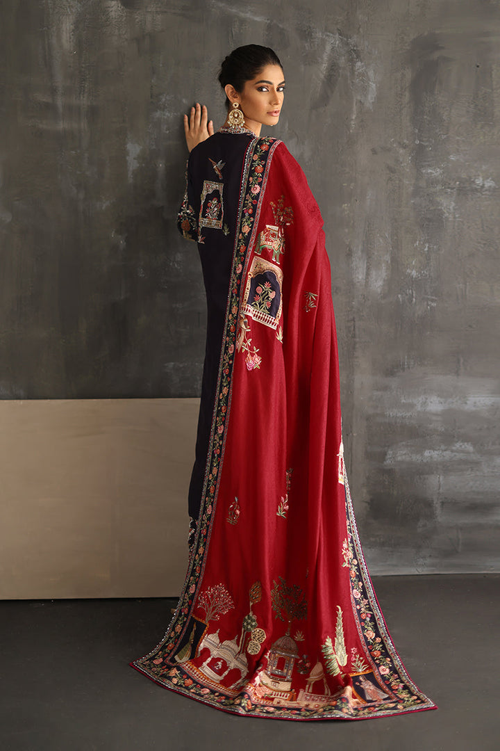 A stunning maroon-hued chaddar made from pure jamawar silk, adorned with assorted appliques in complementary colors. Intricately hand-embroidered using pure silk threads, reflecting our distinctive signature style. This chaddar can be paired with a purple raw silk shirt, finely hand embroidered with resham and zardozi embroidery. The shirt is elegantly paired with a matching izaar adorned with zardozi and resham work, completing the captivating ensemble
