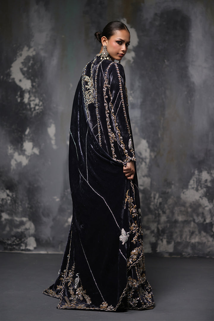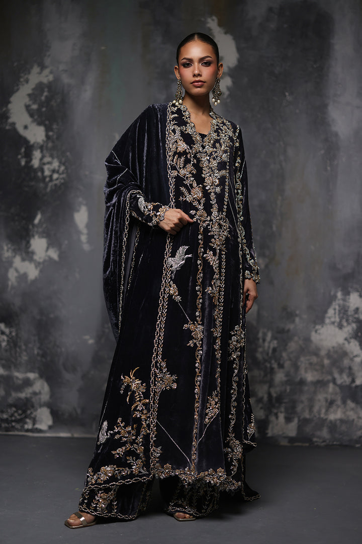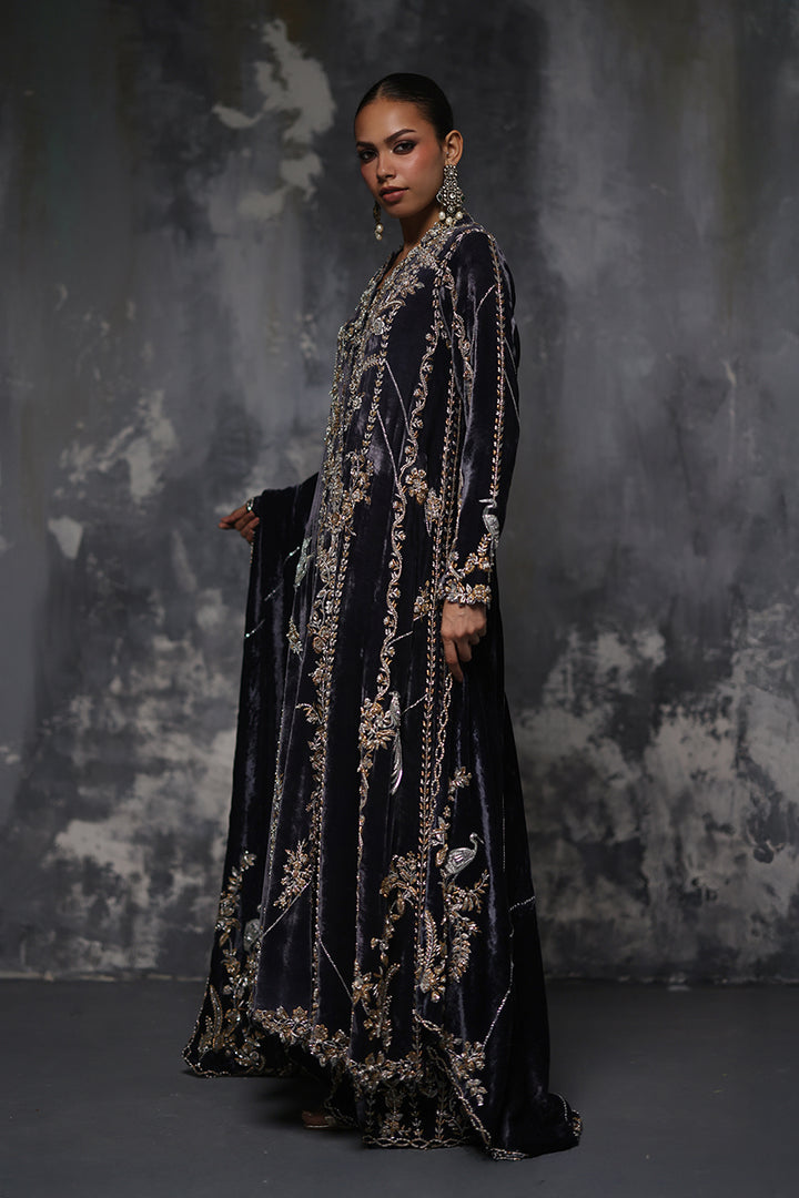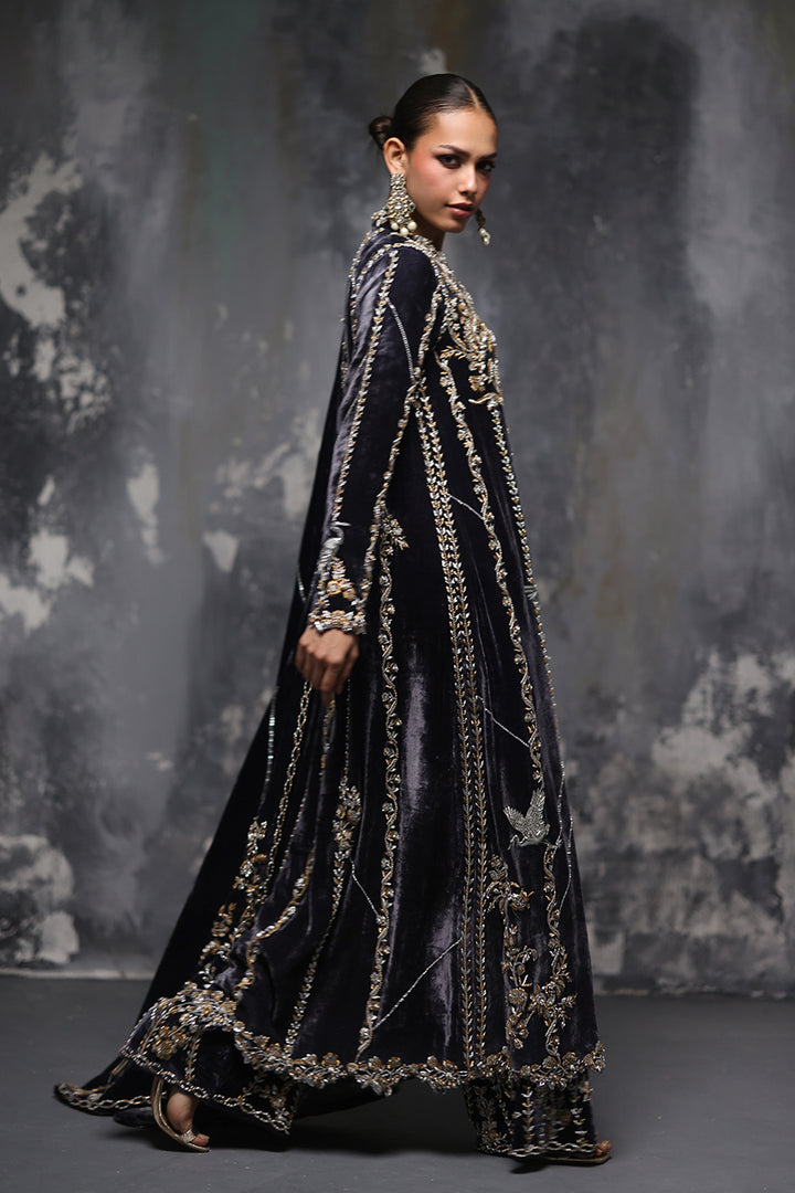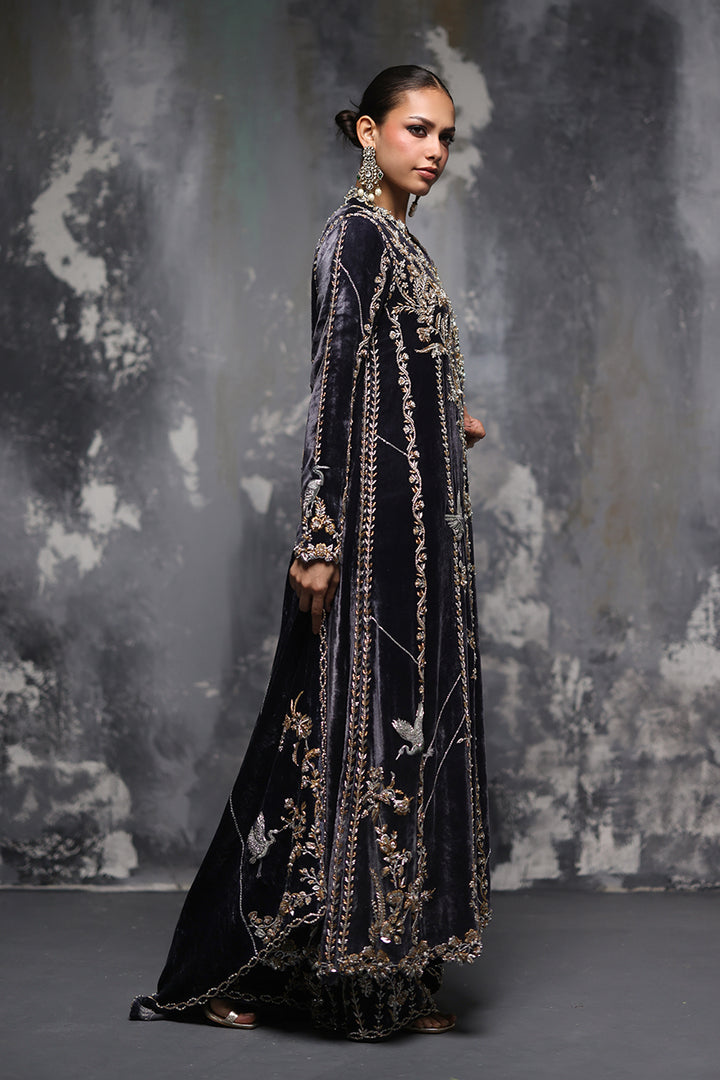 Echoing Mughal splendor, this four-piece ensemble in charcoal velvet tells a story of light meeting texture. The chogha carries handworked zardozi, sequins, and kamdani — every motif rendered in warm gold, copper, and silver. Floral vines descend from the shoulders into a fine lattice of geometry, birds, and bouquets in a glimmering symphony. Artfully arranged florals trace the neckline, flowing down the front-open form. The cuffs match the rhythm, while the sleeves are patterned with more floral details. Framing the piece, florals edged in cutwork line the hem, tying back into the organic definition and movement on the sleeves, neckline, and placket. The matching izaar and solid camisole balance the richness above, with a shimmering nod on the izaar hems, matching in form and craft. Completing the vision, a velvet dupatta, bordered in matching handwrought geometries with blooming florals and birds at each corner, is a modern ode to royal ateliers and the patience of hand embroidery.