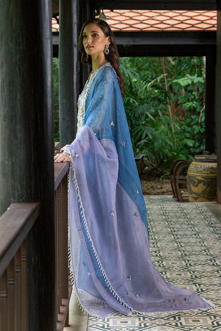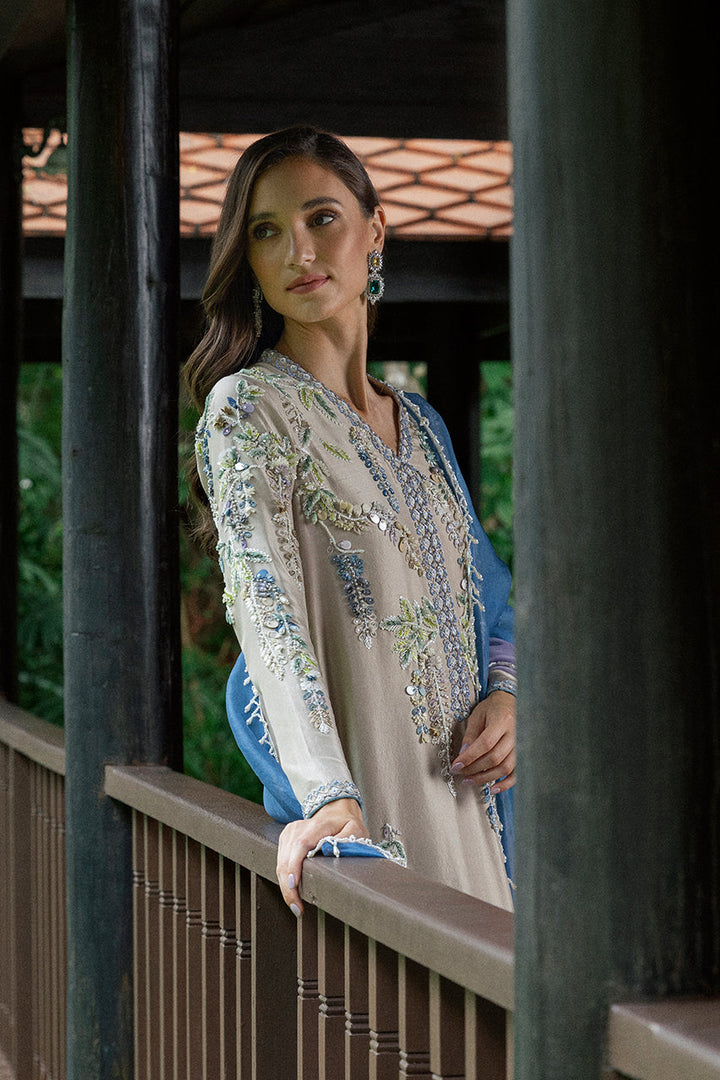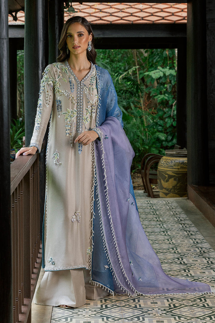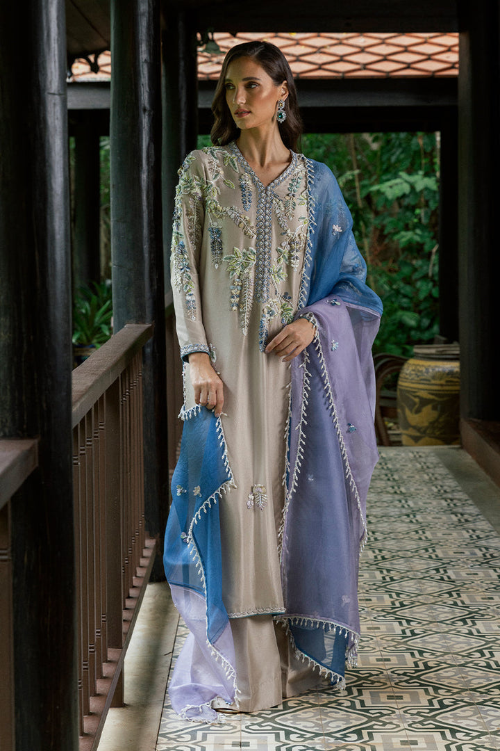 Pastel yet striking, this ensemble creates drama from delicate handwork and dimensional flourishes. The straight kurta in almond beige silk glistens with hand embroidered wisteria vines, crafted from crystals, fabrication, beads, sequins, and hints of silver zardozi. Soft-hued florals trace down from the shoulders in natural asymmetry, tapering into lighter bouquets scattered below the bodice. The sleeve cuffs, side seams and hem sparkle with sequined floral borders, dimensional yet delicate. Silk bell-bottom pants ground the composition, their cut elongating the silhouette. The two-tone dupatta, organza shifting between lilac and