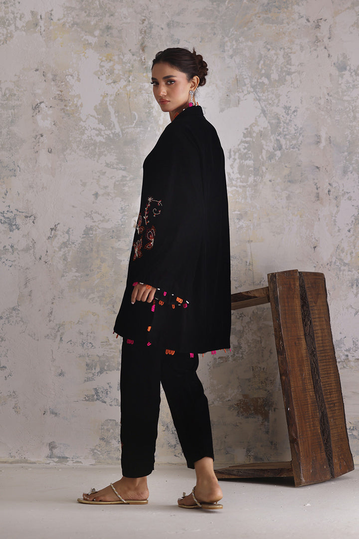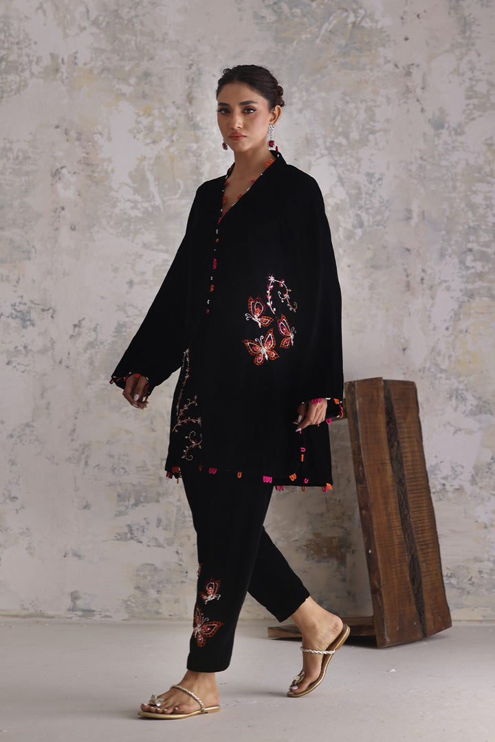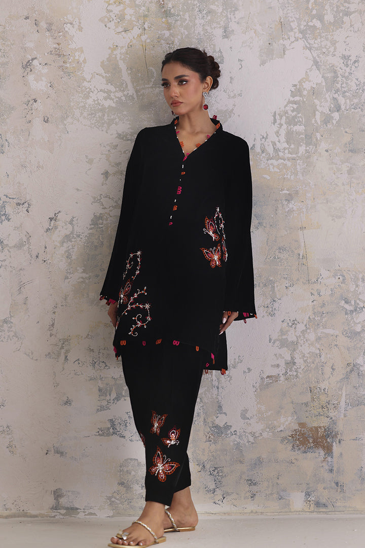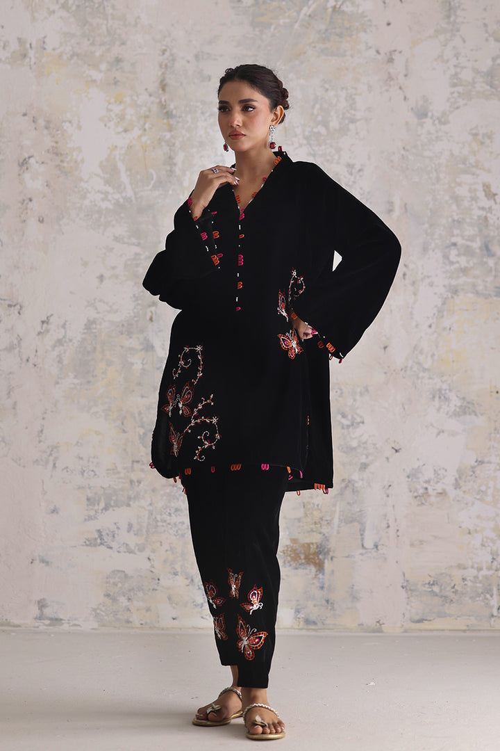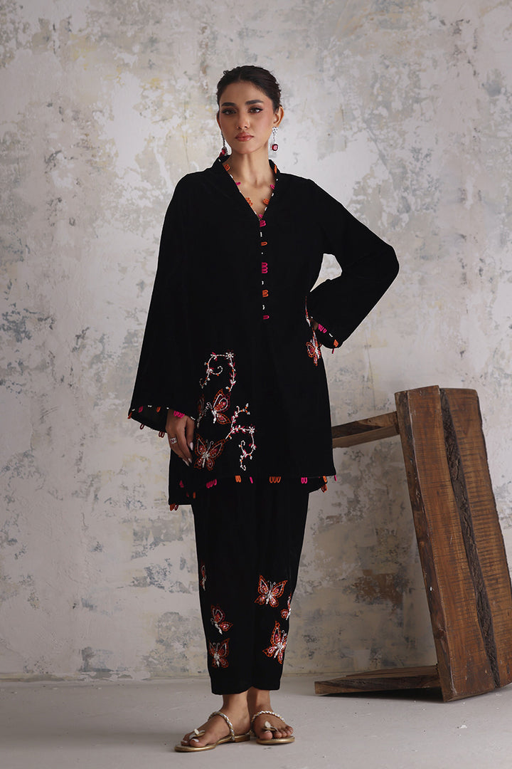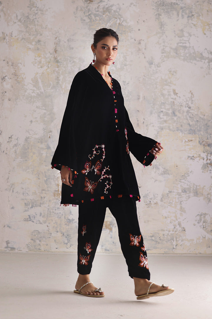 A whisper of fluttering wings turns velvet into poetry. Butterflies and florals in fuchsia and orange drift across the black surface, defined by fine embroidery and glistening sequin and beadwork. The short kameez feels balanced — ornamented yet airy — with matching accents edging its borders in rhythmic intervals. The slim shalwar matches the whimsy with adorned details near the ankle, completing a piece that celebrates texture through restraint.