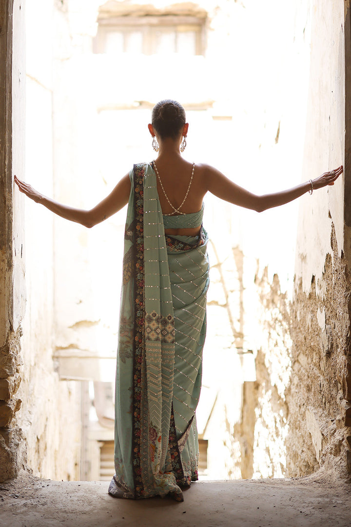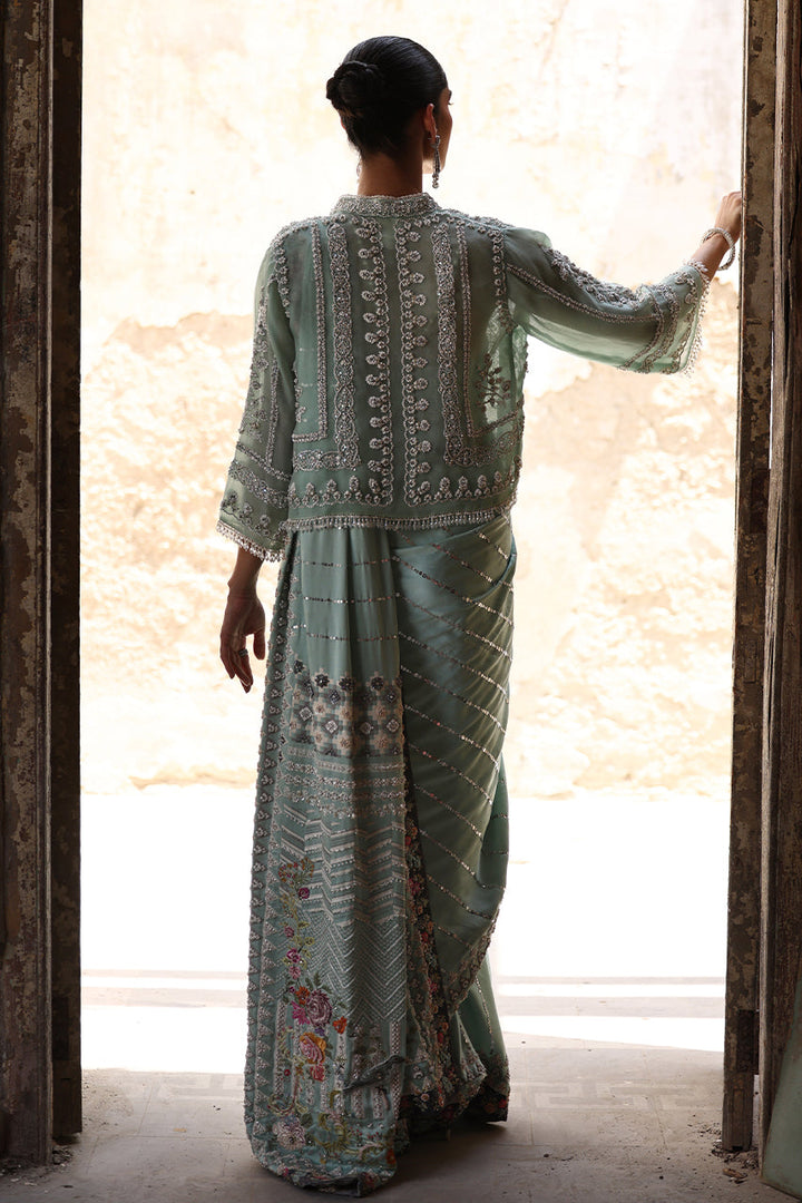This stunning ferozi pure Charmeuse silk sari features intricate screen-printed 3D zardozi embroidery with exquisite resham hand work. The sari is paired with a pleated blouse, adorned with delicate pearls. To complete the ensemble, a ferozi short jacket in pure organza showcases intricate 3D embellishments and zardozi hand work offering a perfect balance of modern elegance and traditional craftsmanship