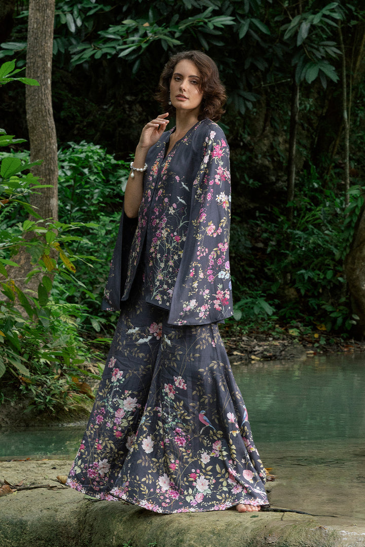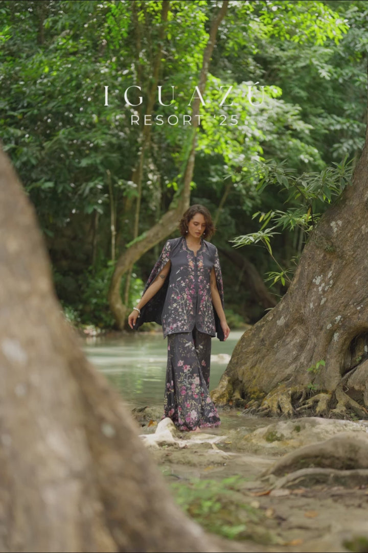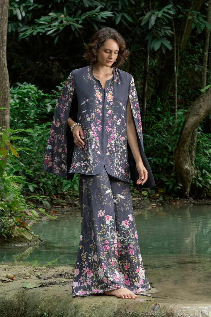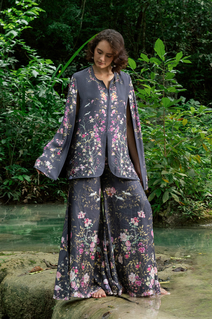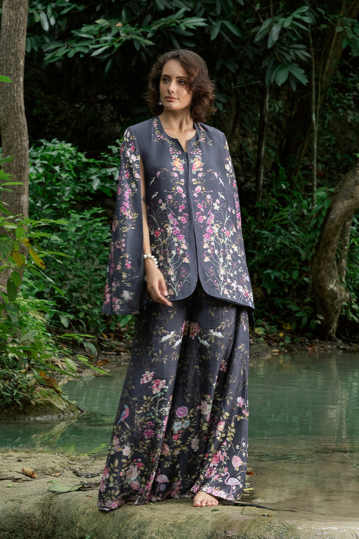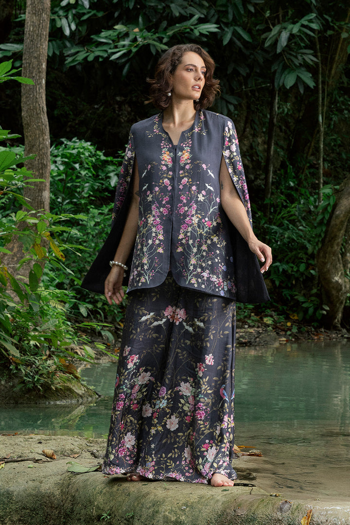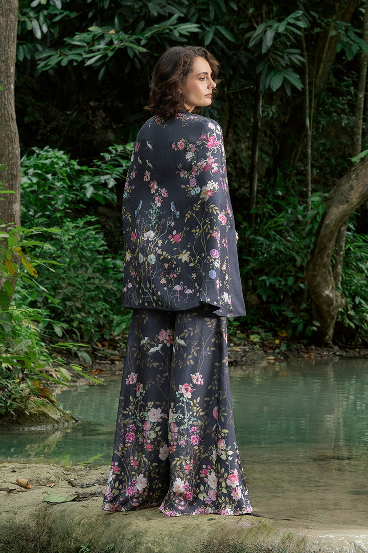 Pure raw silk in black provides a luxe backdrop for vividly colored florals, printed across the layered top and pants. The cape-style top drapes effortlessly, layered over a plain deep-hued camisole that lets the print shine. Dramatic flared pants echo the same lively motifs, allowing the silk to move fluidly while the print pops in contrast.