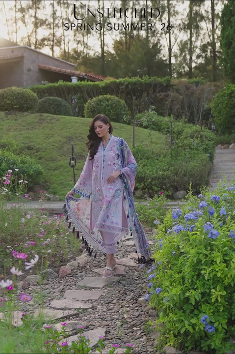 Cool lilac meets floral precision in this serene summer suit. An embroidered symmetry blooms across premium lawn in lavender, green, and blue hues. Embroidered neckline trim and organza borders for the hem and cuffs finish with lightness. Matching solid lilac bottoms and a printed pure silk dupatta completes this story of airy refinement.