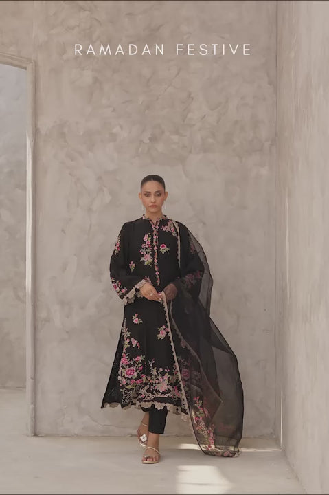 Delivery in 2-3 WeeksTexture and technique define this floral composition. Rendered in black kora, the long kameez is adorned with cross-stitched florals in blushing hues and beige, scattered across the steeves and length before gathering in density at the hem. Cutwork embroidery introduces moments of lightness, lining the sleeves and hem with restraint. Paired with straight black kora pants and a black organza dupatta, featuring flowering tendrils and cutwork embroidery along the pallus, with subtle trims. A refined ensemble alive with color and craft.