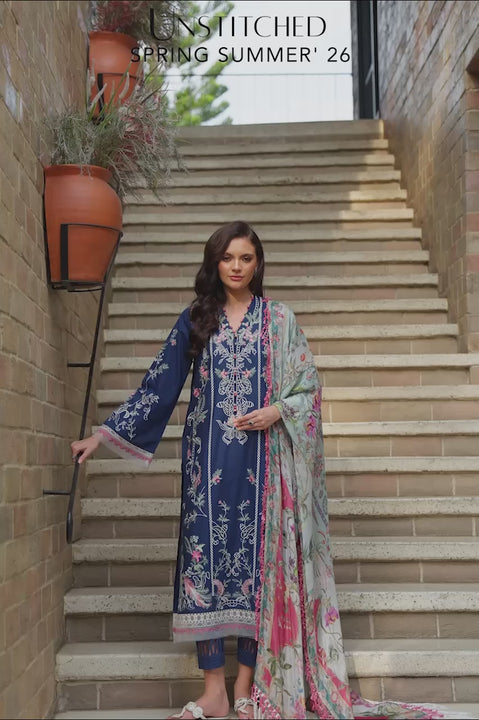 A refined take on summer elegance in navy premium lawn. Embroidered leafy sprigs and delicate blossoms unfold along the length and sleeves, finished with organza borders for the hem and cuffs. Paired with solid navy bottoms and a printed pure silk dupatta, this suit is perfection for striking daytime looks.