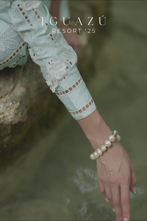 Tailored elements meet relaxed form in this co-ord. A collared button-down shirt with cuffed sleeves carries symmetry through its lines, while straight trousers bring in resort ease. The pure silk in aqua amplifies the set s brightness, its sheen catching light with every move. White cutwork details, with embroidered and appliquéd florals, layer the silhouette thoughtfully, balancing craft against simplicity.
