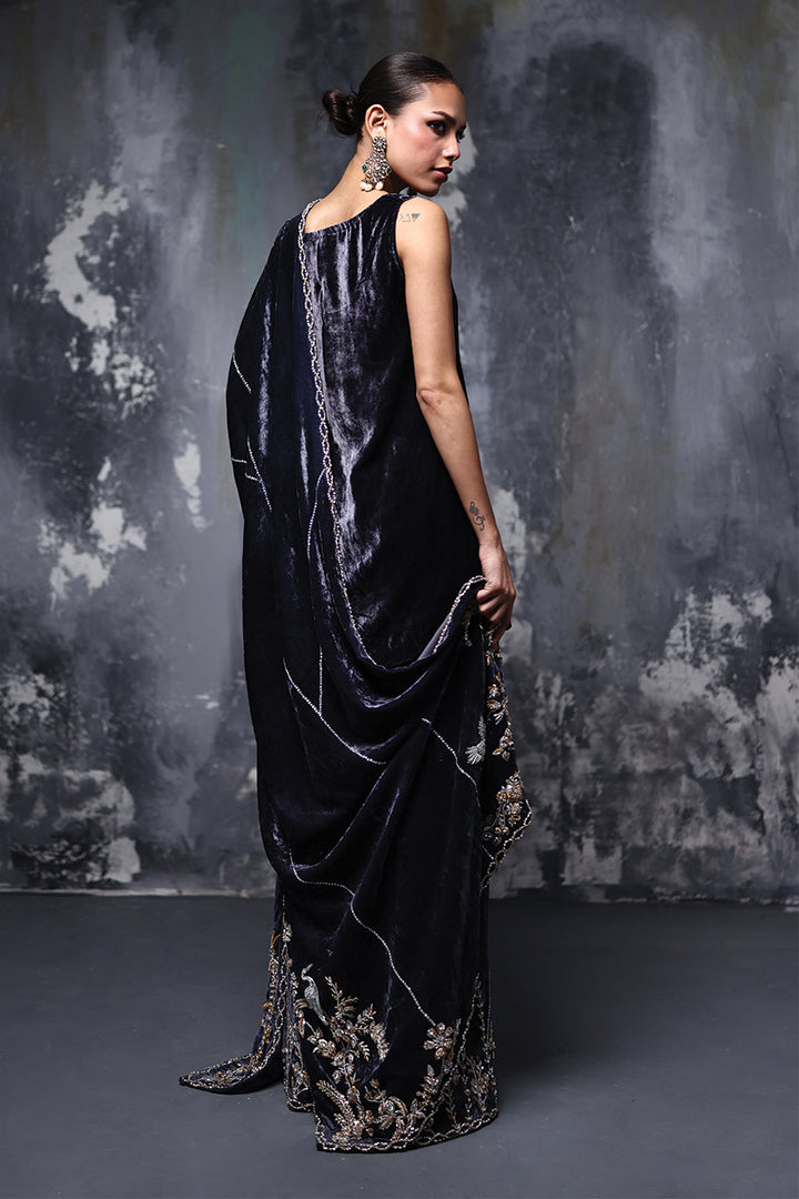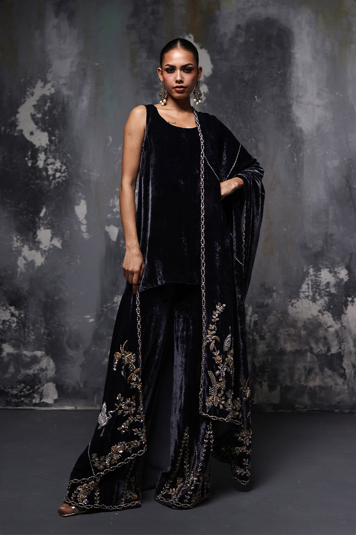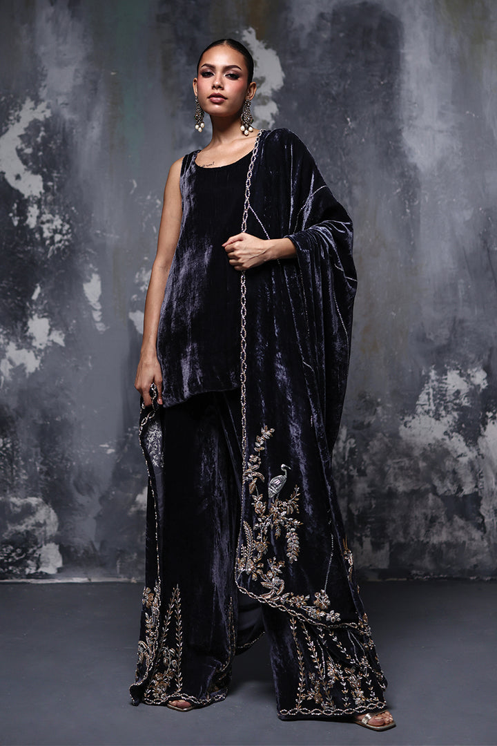 Balanced and deliberate, this charcoal velvet set is an ode to Mughal heritage, versed in gold, copper, and silver threads. A simple, short top is draped over with a tonal dupatta, its borders glistening with zardozi, sequins, and kamdani embroidery and corners adorned with florals and avian motifs. The relaxed volume of the izaar completes the look, its hems touched with heritage craft in shimmering floral tendrils and geometric forms. Crafted entirely by hand, this three-piece ensemble lets the intricate details convey its regal essence.