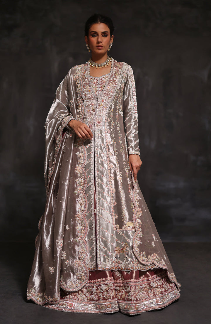 Elevating the look further is a dark metallic silver scalloped dupatta, meticulously hand-embroidered with zardozi and resham work, offering a festive bridal aura. Prepare to captivate attention and leave a lasting impression in this breathtaking outfit exuding unparalleled grace and beauty. This masterpiece not only makes a statement but also provides versatility in styling, ensuring an unforgettable presence and timeless elegance for years to come.