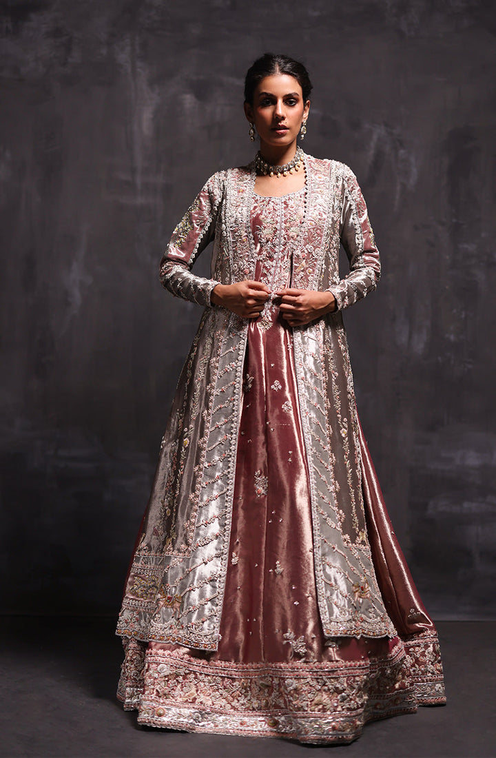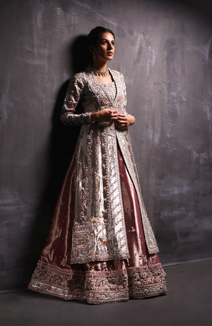 Introducing our contemporary masterpeice, an exquisite dark metallic silver jacket adorned with delicate petal pink and silver appliques, meticulously hand-embroidered with resham and zardozi work. Paired seamlessly with a metallic silk kalidar in a mesmerizing shade of petalpink, the kalidar boasts intricate hand-embellishments featuring charming birds and floral borders, crafted with finesse using zardozi and resham work. The ensemble showcases a symphony of intricate techniques.