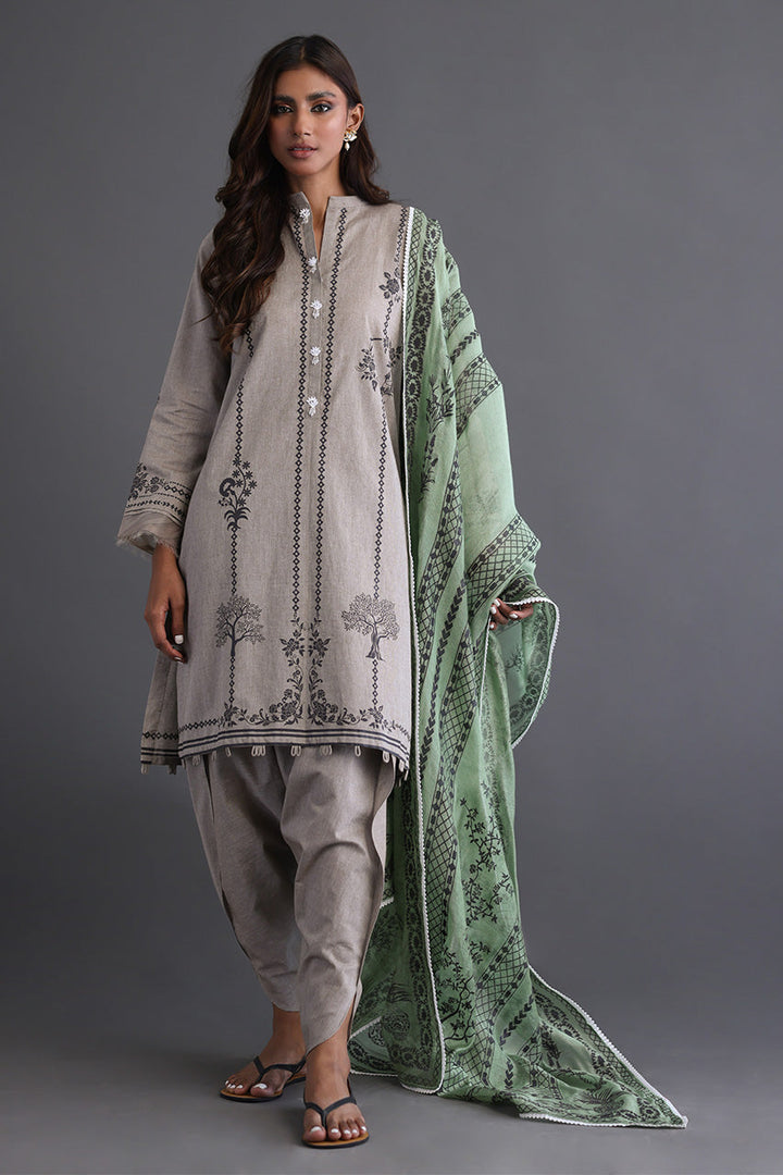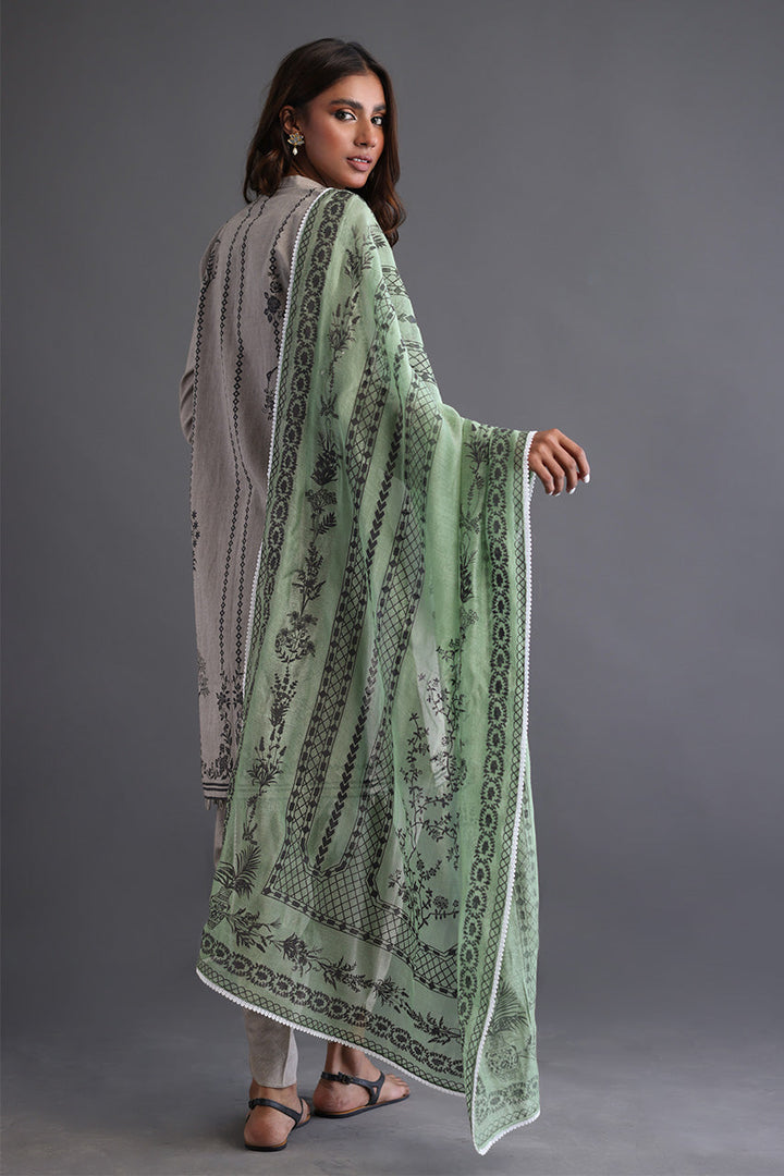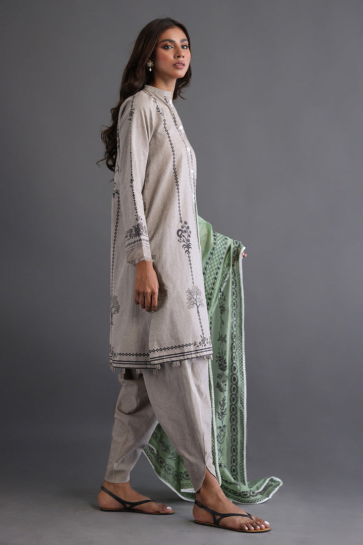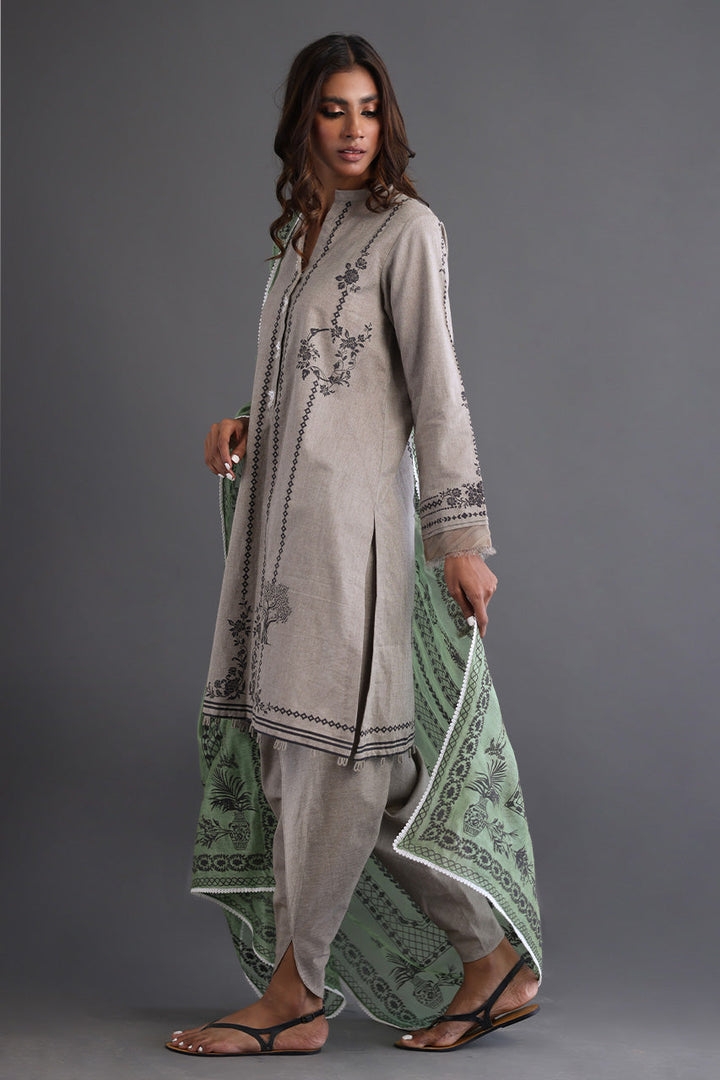 A classic beige screen printed shirt inspired by the beautiful flora and fauna paired with a smartly tailored tulip shalwar and a complimentary grassy green dupatta with lace finishing. The Perfect outfit to channel your individual style no matter the occasion!