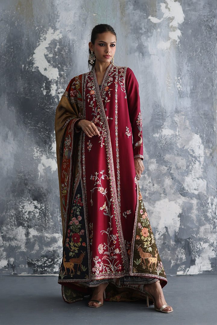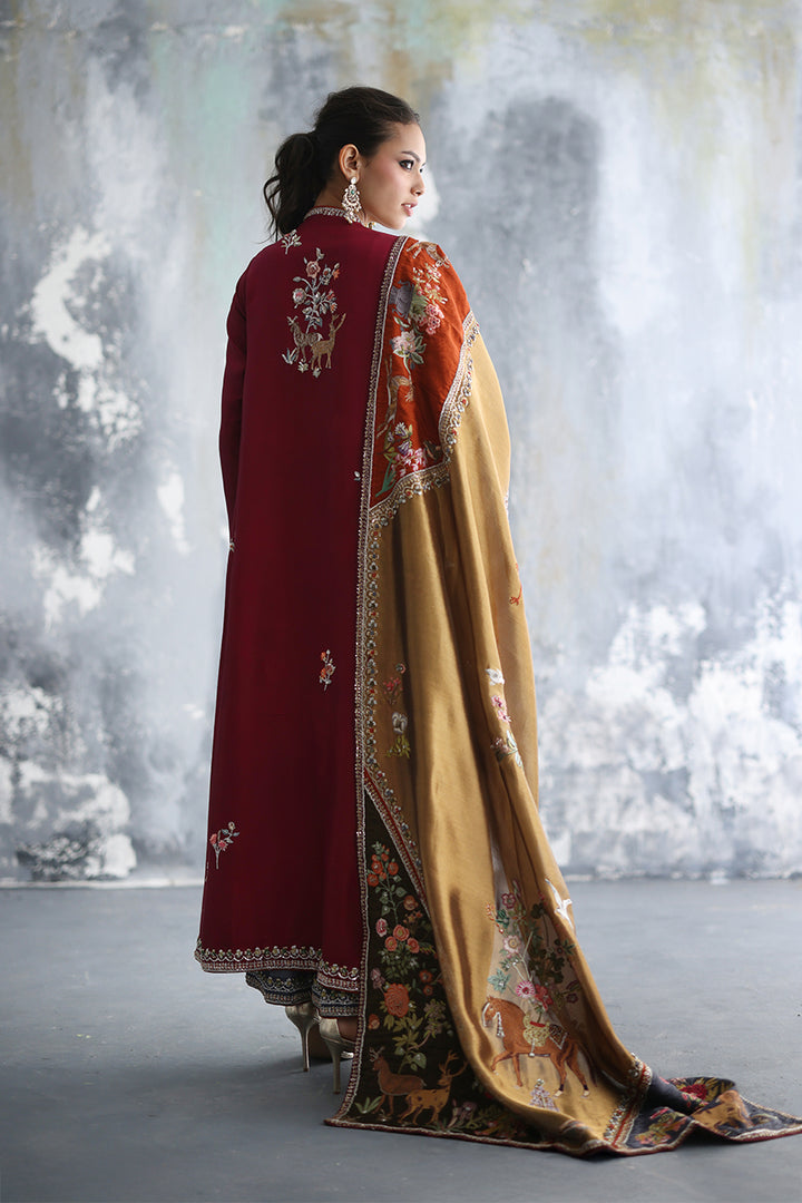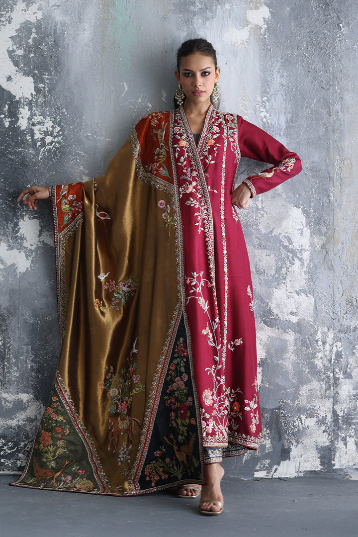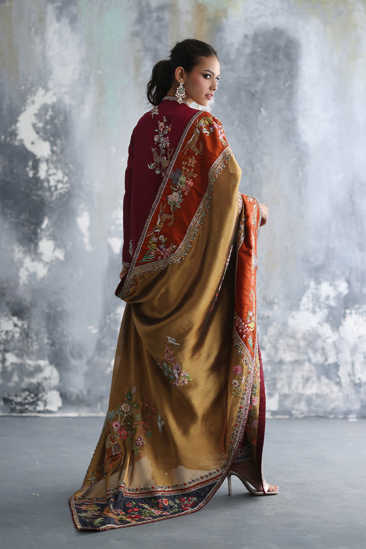 Copper silk, luminous, holds a garden of stories. Framed by jamawar appliqués in khaki, grey, and rust, vibrant with embroidered creatures and florals in radiant resham hand embroidery. Sequins scatter like light caught mid-movement, while zardozi borders trace each line, framing each appliqué and the tapestry itself in threads of silver and white gold. The chaddar becomes more than textile — it is a living painting, a refined mosaic of motion and memory.