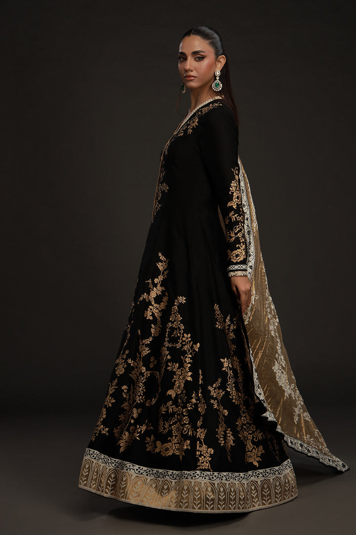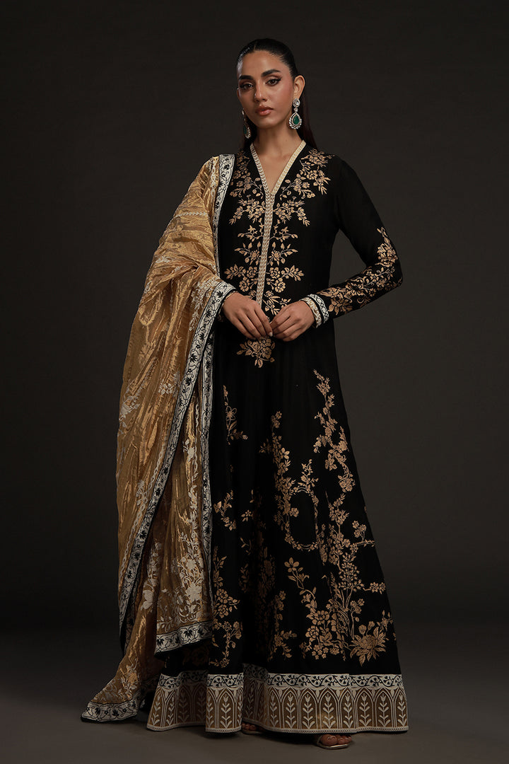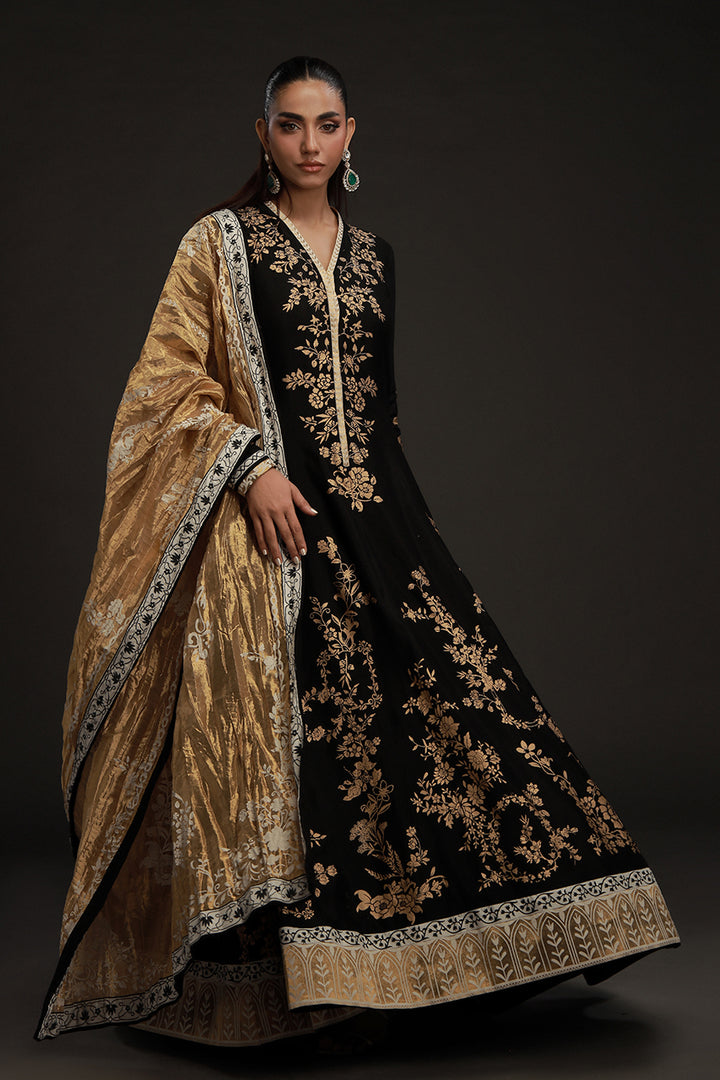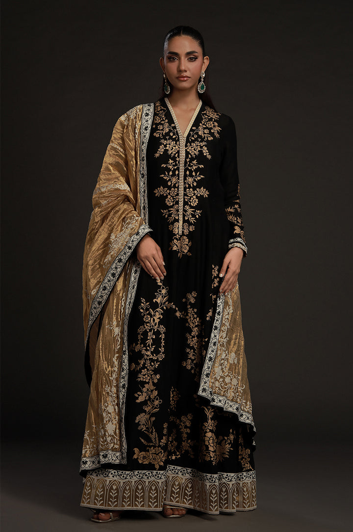 Dark and light meet in perfect harmony in this striking kalidar. Its rich black kora base is brought to life with gold screen-printed florals, thoughtfully placed along the neckline, sleeves, and sweeping hem to create a sense of rhythm. Ivory cotton silk and gold tissue borders finish the hem, amplifying the printed flourish and echoed in finer trims at the neckline and sleeves. The matching straight black pants keep the look grounded, while the gold tissue dupatta brings light, its screen-printed motifs delicately spaced and framed with ivory borders for balance.