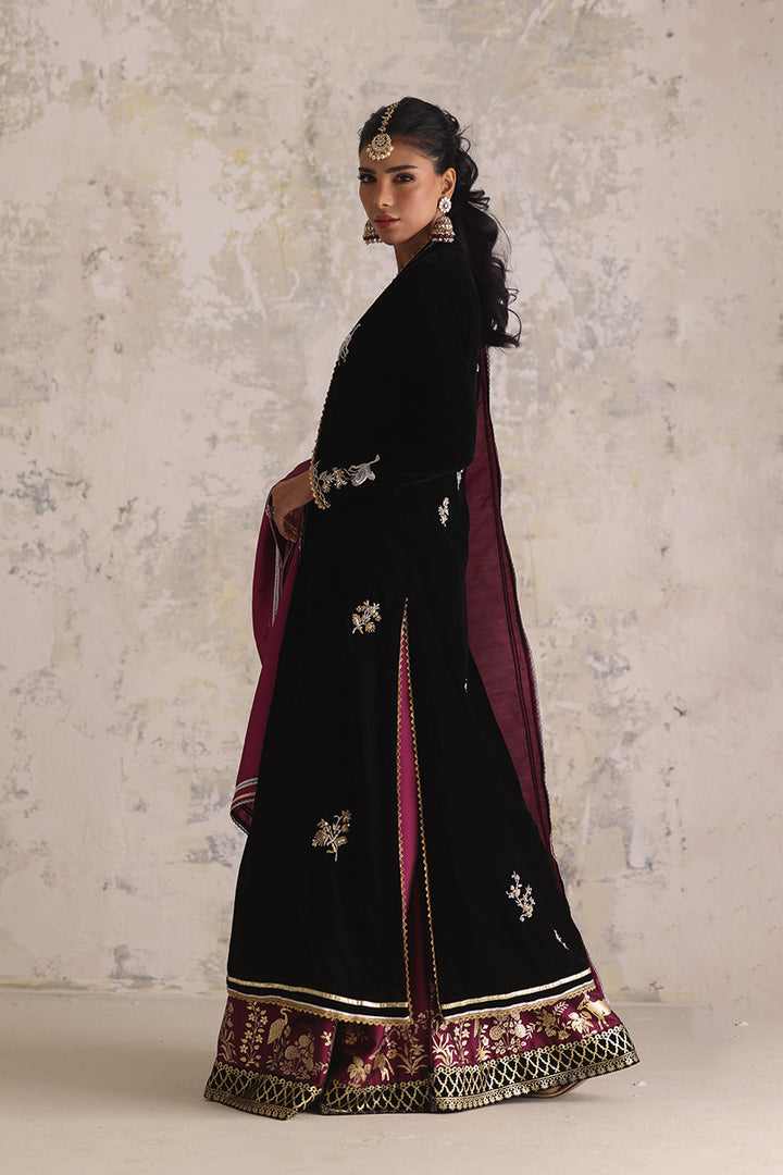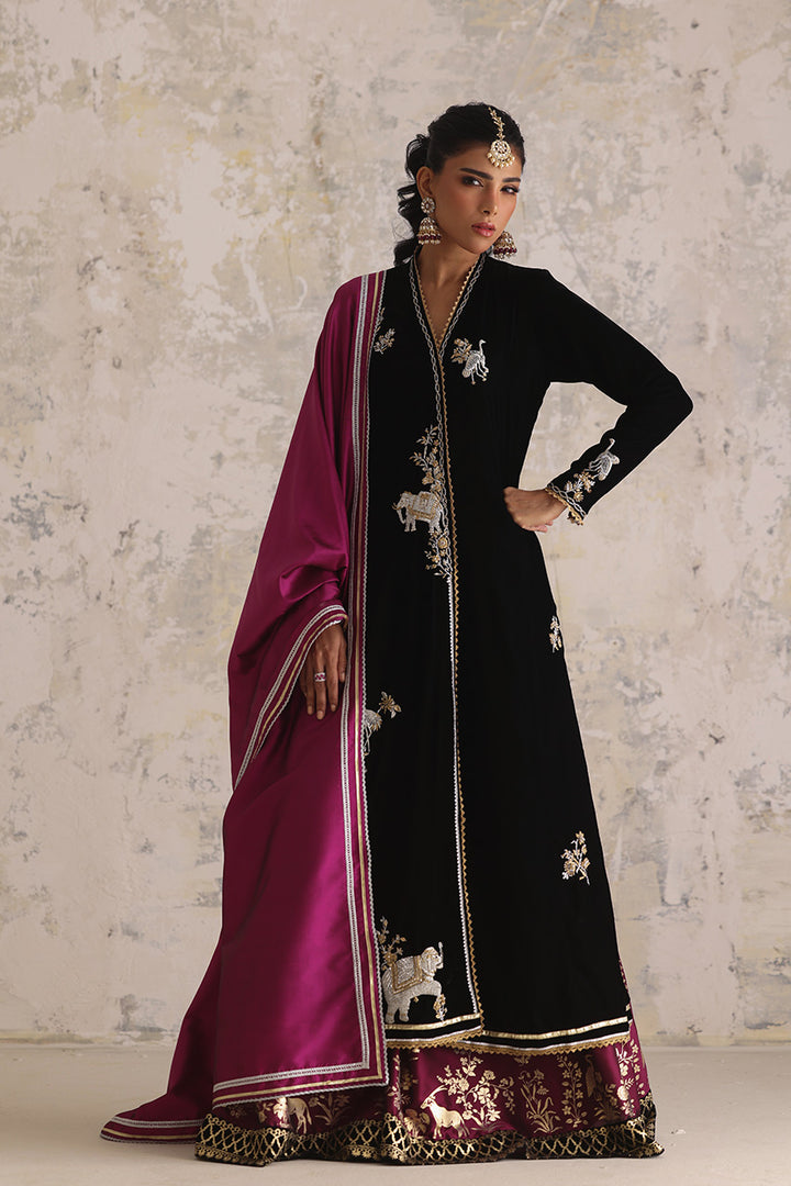 A portrait of regal artistry, this long black velvet aba draws from the grandeur of Mughal courts. Handcrafted zardozi in gold and silver trace the neckline and front seam with delicate geometries that give way to flora and fauna motifs, each glimmering softly. Differing bouquets and motifs adorn the length and sleeves, with sequins and beads enhancing their opulence, while metallic trims and gota frame the edges. Deep magenta katan silk dhaka pants introduce a vibrant counterpoint, their hem alive with gold foil-printed motifs and velvet borders. Completed with a light magenta katan silk dupatta, edged in silver and gold trims, the ensemble radiates measured richness — timeless, majestic, and meticulously composed.