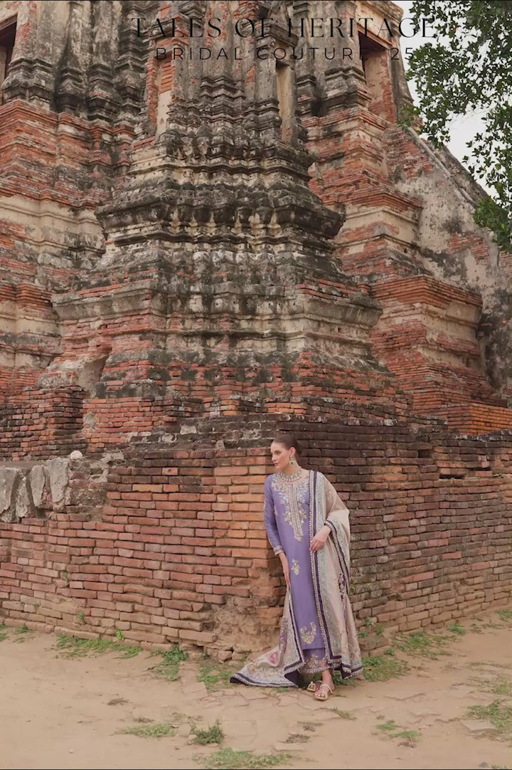 This ensemble is for the woman who seeks quiet majesty, with a piece where color and craft meet in graceful restraint. The pure raw silk kurta in deep lavender is designed to elongate her frame, and features an eye-catching bodice with floral resham embroidery alive with hues of orange, pink, and green, and a placket traced in fine silver and gold zardozi. Light florals scattered across the silk surface give it texture without excess, balanced by sleeves detailed in elegantly embroidered floral trails. The izaar beneath glimmers with embroidery at the hem, its vibrancy revealed with every movement. When draped with the chaddar, she is transformed gold silk bordered in jewel tones and layered in pink and purple appliqués, detailed with resham and zardozi motifs that catch every glance. She becomes luminous, radiant not through volume, but through richness and poise.