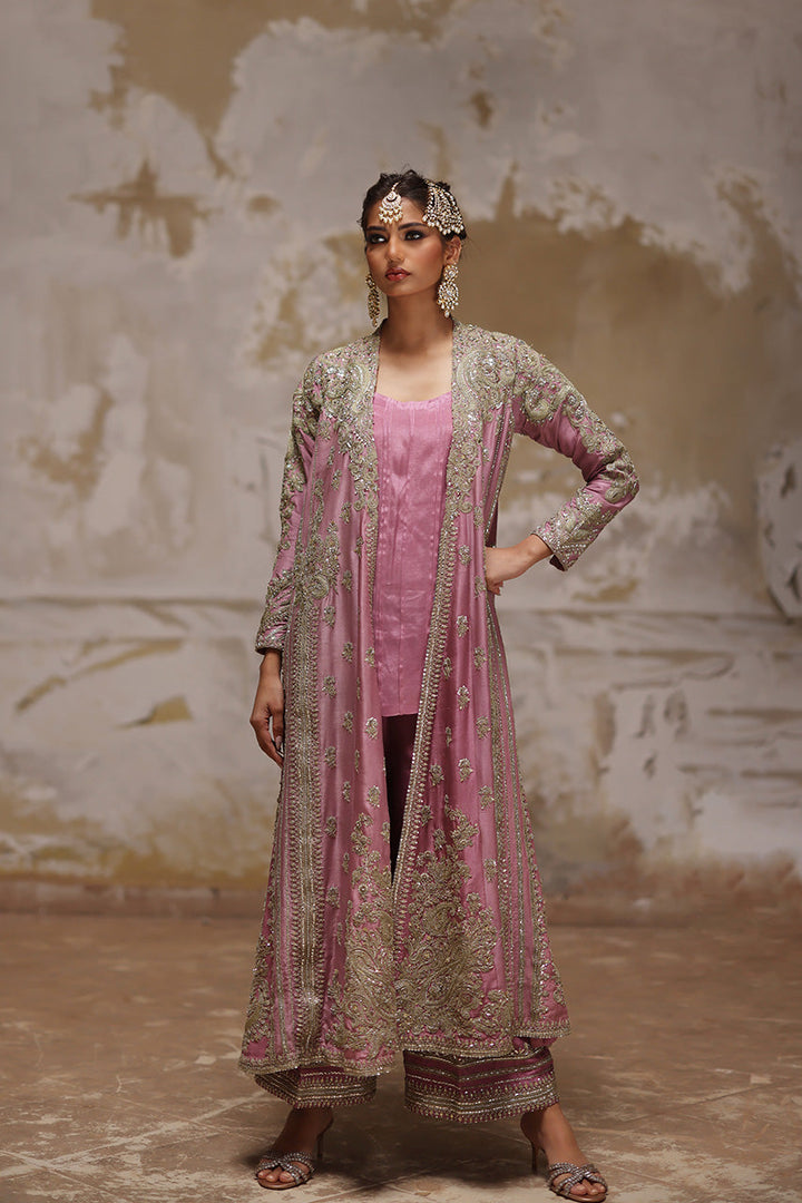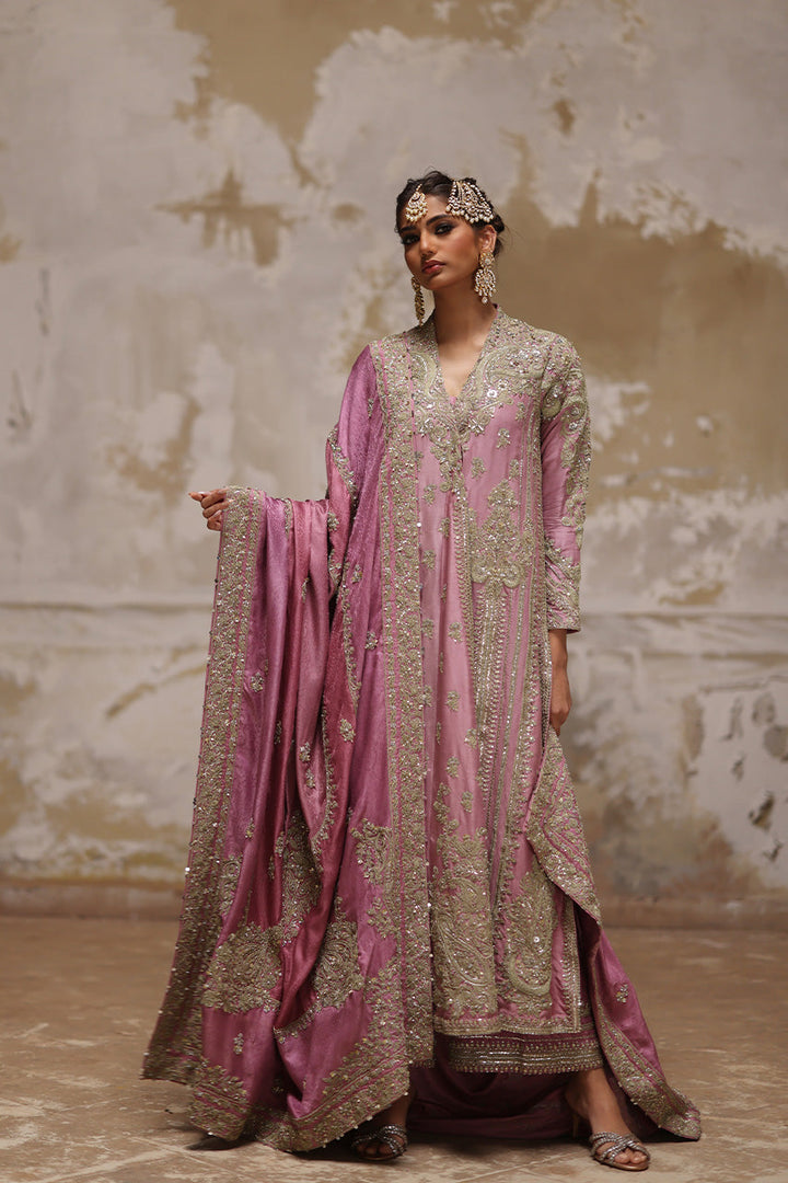 This luxurious bridal ensemble features a Chogha made from pure raw silk, meticulously hand-embroidered with intricate Marori Gota and Zardozi work. It is paired with pure Jamawar silk dupatta, enhancing the regal allure of the outfit. The ensemble includes an izar, crafted from pure raw silk and adorned with fine Marori embroidery, offering a harmonious blend of tradition and elegance. The entire outfit is rendered in a beautiful palette of pinks, making it a versatile and timeless choice for the modern bride.