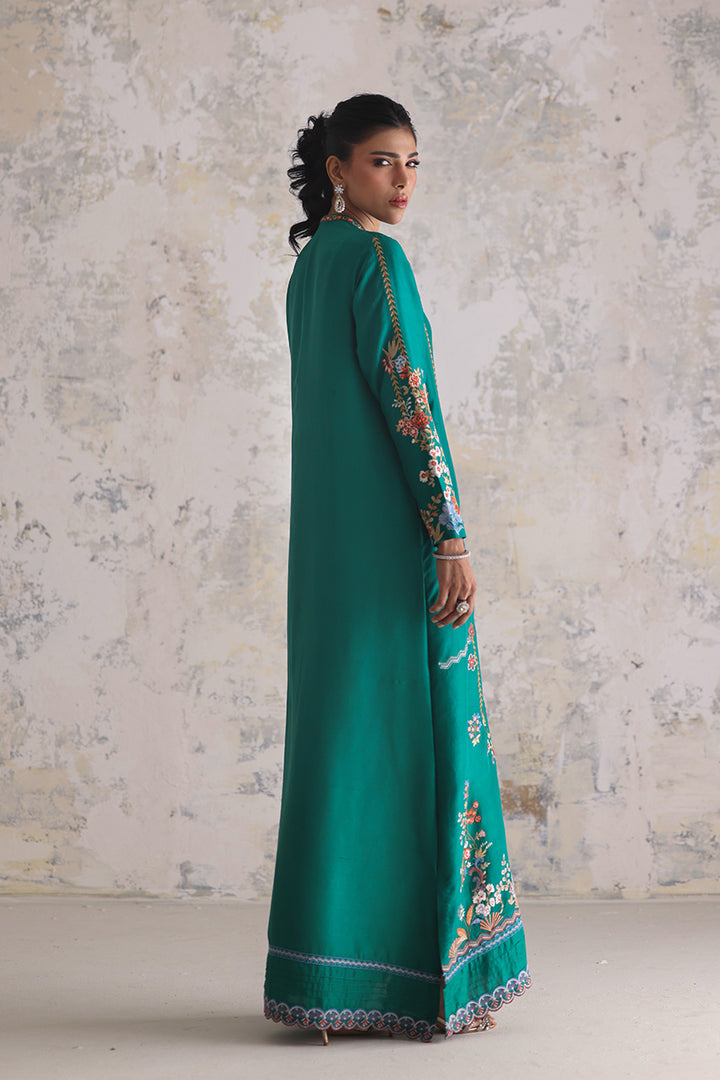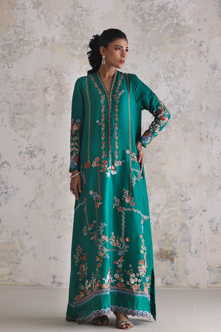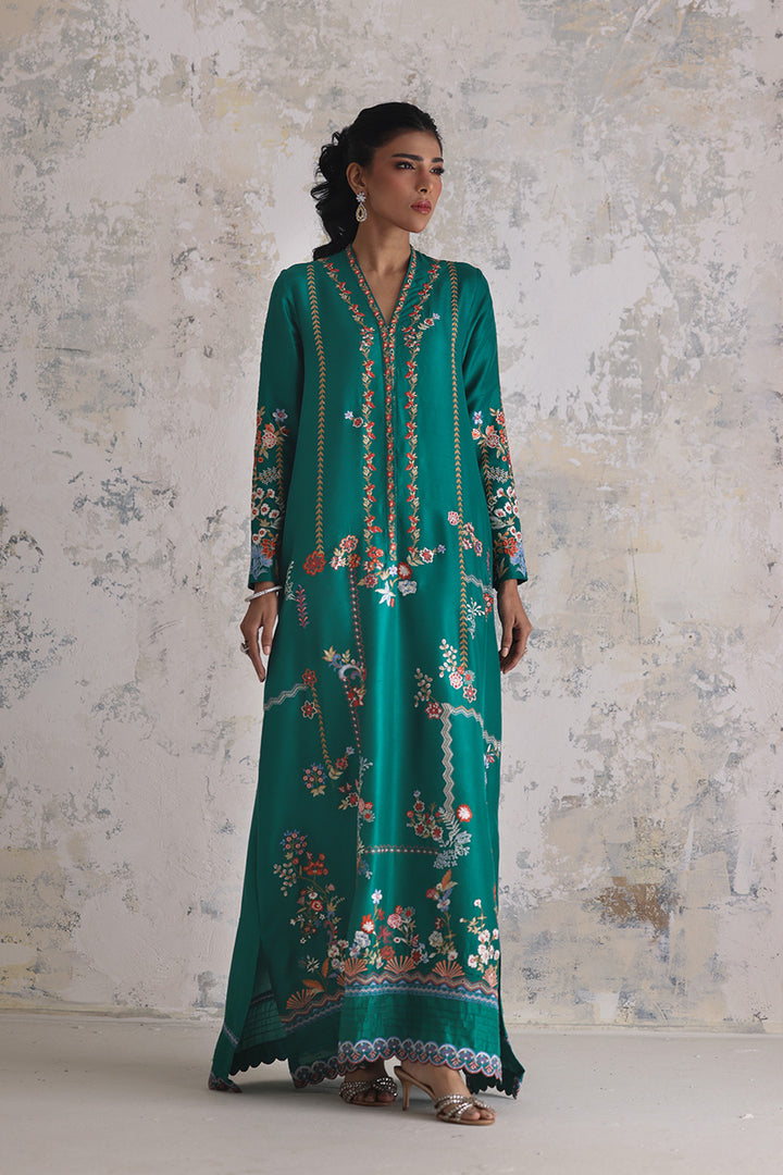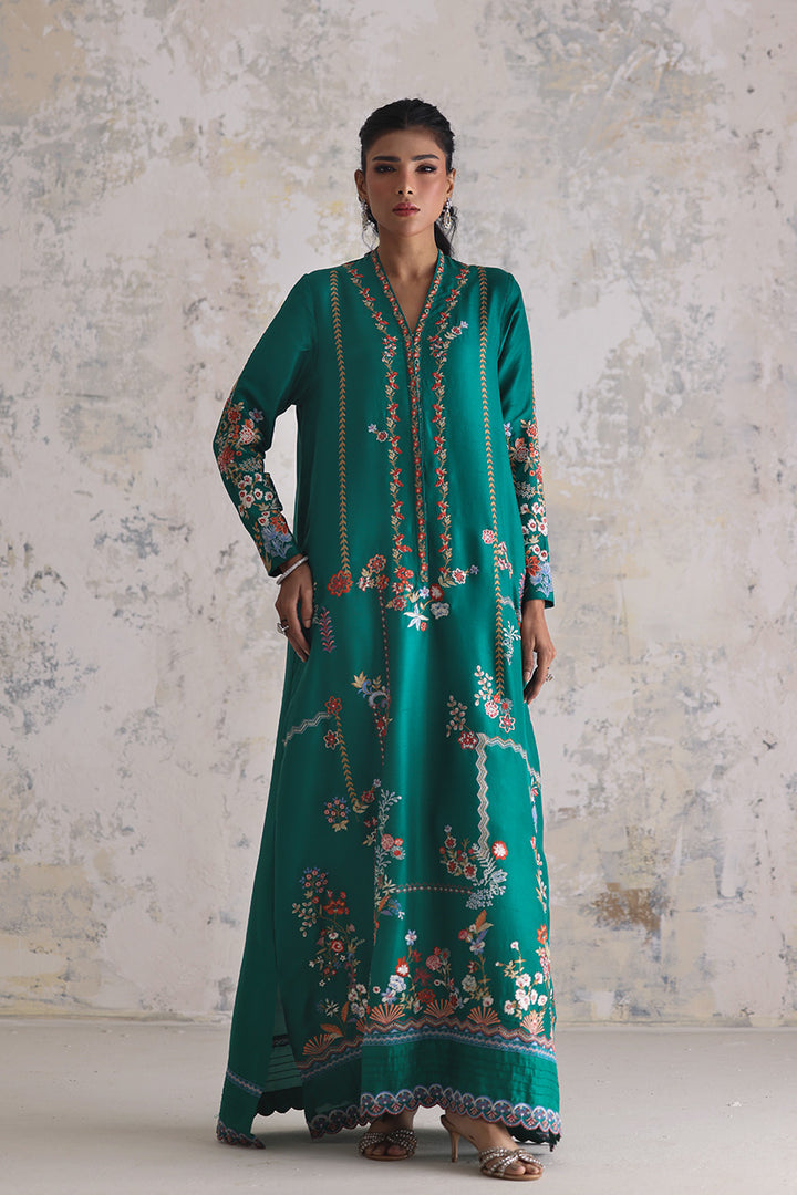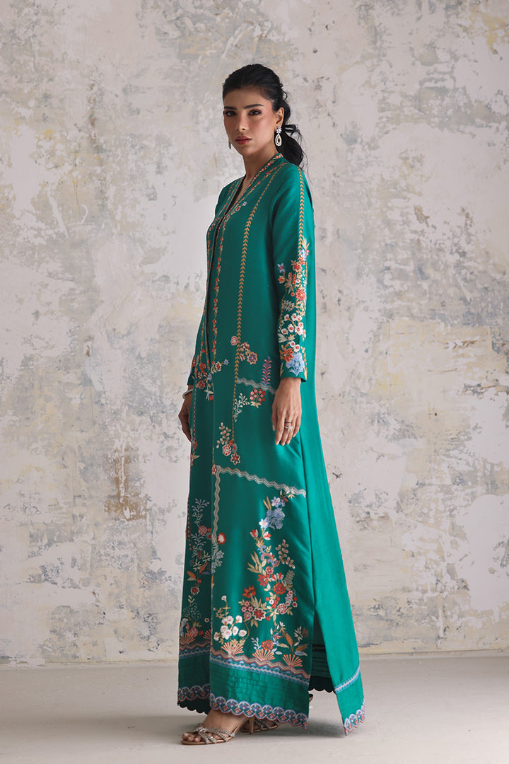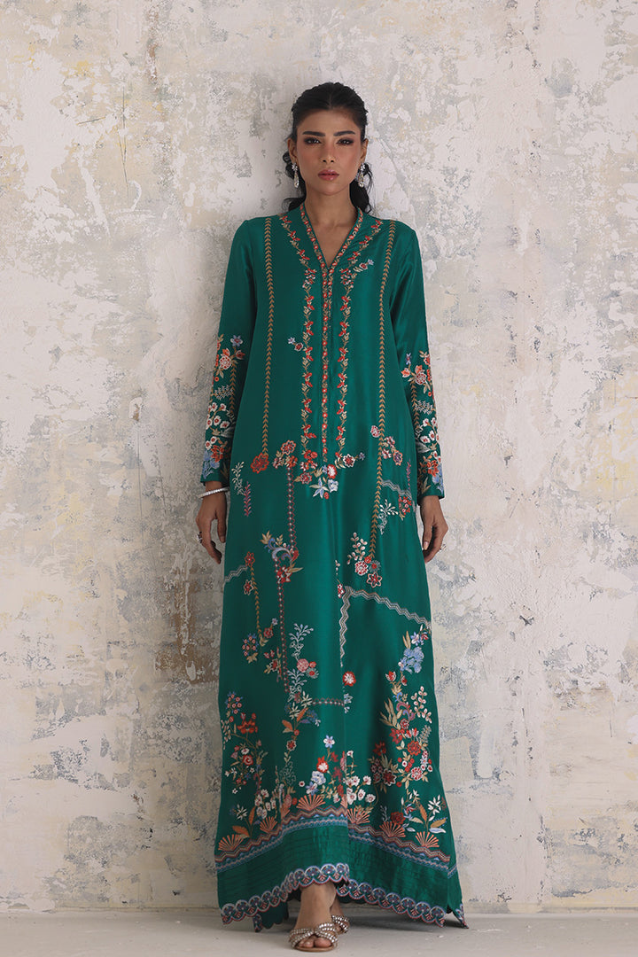 An expression of easy opulence, this light emerald kaftan captures the joy of intricate craft. The pure raw silk drapes softly, its expanse and sleeves embroidered with vibrant threads that weave between florals and geometry in gentle rhythm. Scalloped florals along the hem add movement and a playful finish — perfect for moments that ask for relaxed elegance.