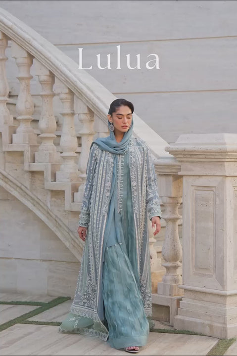 This blue organza standout finds its strength in texture. The A-line jacket carries a rhythm of geometric bands, floral trails, and appliqué panels. Each surface is adorned with intricate screen prints and hand embellishment for depth and sparkle without weighing it down. Subtle lapels and lightly detailed hem balance the piece. Complementing the jacket, the old blue organza kalidar flows with vertical pleats that animate the fabric, accented by floral handwork at the neckline and cuffs. A matching shella edged with crystal droplets completes the look