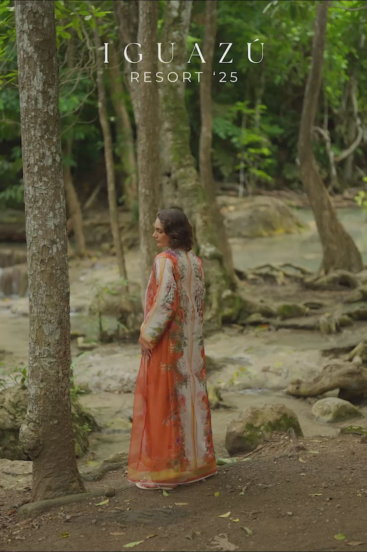 The organza jacket carries a delicate architecture of print a column of white framed by peach, blooming wildflowers dance softly on that border in mirrored rhythm. On sheer fabric, the arrangement feels almost suspended, every motif diffused by light. Beneath, the pure silk kaftan repeats the story in deeper tone, a continuation that grounds the jacket s airy surface, while tassels on its collared neckline lend crafted punctuation.