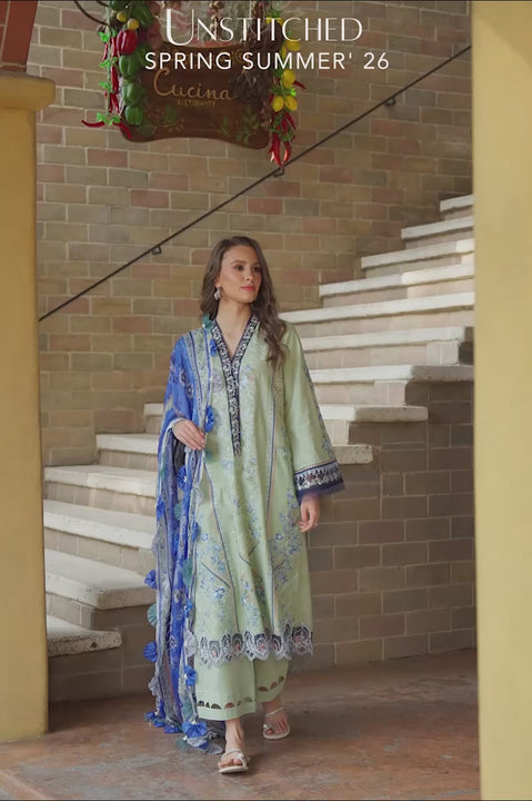 Set on calm sage, this premium lawn suit celebrates contrasts. Delicate floral trails in blue, white, and caramel embroidery adorn the length and sleeves, framed with organza borders for the neckline, hem, and cuffs. Matching solid bottoms and a printed pure silk dupatta complete the light composition.