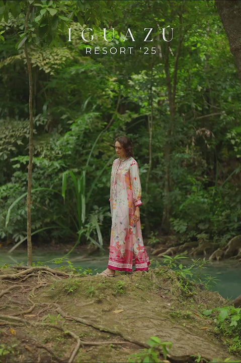 This kaftan feels like a lively daydream pink color-blocked pure silk alive with whimsical prints, with botanical and abstract motifs wandering freely across its surface. Handmade fabric buttons trail from the band collar like little accents, echoing the playful rhythm of the silhouette.