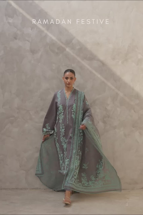 Delivery in 1 WeekCrafted from grey cotton, the kameez features turquoise floral vines flowing across the body and sleeves, balanced by a pared-back motif tracing the neckline. The sharp screen prints and intentional placement allow the details to breathe across the surface. Matching grey cotton pants sit beneath, while a grey cotton net dupatta completes the set, where floral screen prints are framed by geometric borders. An uncomplicated ensemble with just enough detail