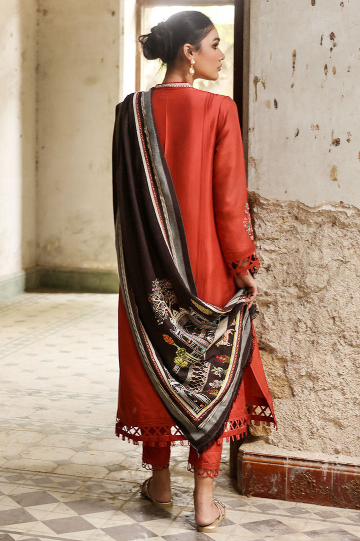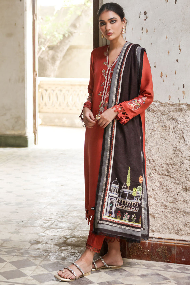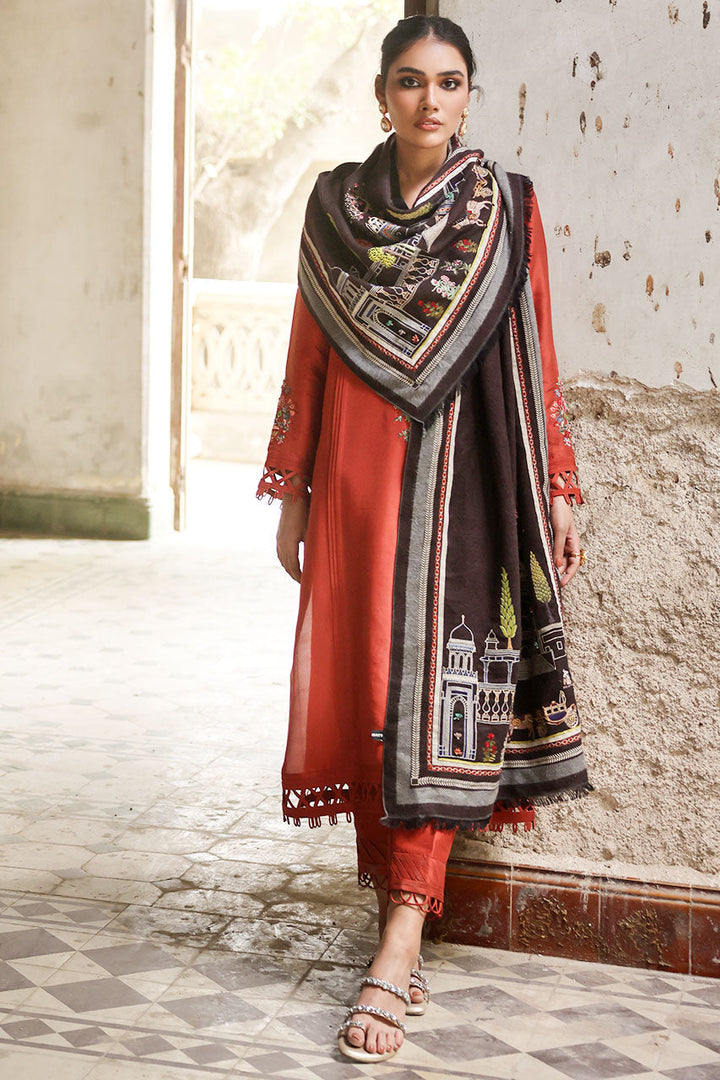 A contemporary shawl with fine hand embroidery finished with hints of ivory screen on pure dark brown pashmina shawl is adorned with enchanted mughal imagery, florals and architecture. It is delicately created with fine silk thread and 3d work.