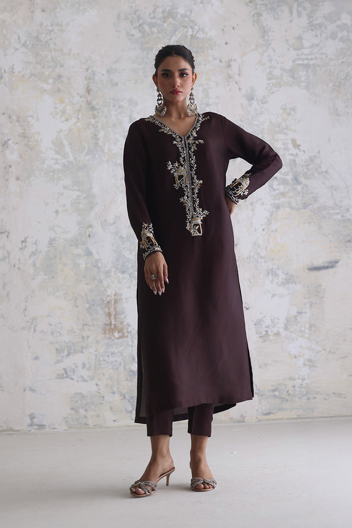 The long, straight kurta flows with calm ease, its shesha silk base catching light subtly with each movement. Hand embroidered architectural and blooming motifs in gold and silver zardozi adorn the neckline placket and sleeves, adding tactile shimmer. Paired with matching straight pants, the ensemble maintains balance and proportion, offering a restrained elegance that carries both presence and comfort.