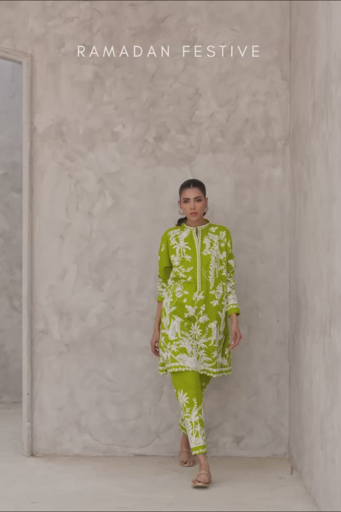 Delivery in 1 WeekPrint-led and refreshingly playful, this chartreuse cotton set brings a zing to everyday wear. The tunic features jungle-inspired screen prints, where botanicals intertwine with animal motifs across the body and balloon sleeves in off-white. Paired with matching cigarette pants, screen-printed with blooming sprigs shooting from the hem. A polished yet spirited choice for days that call for color and comfort.