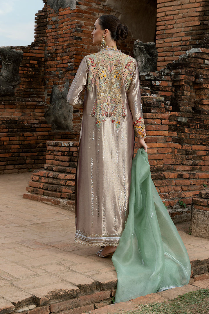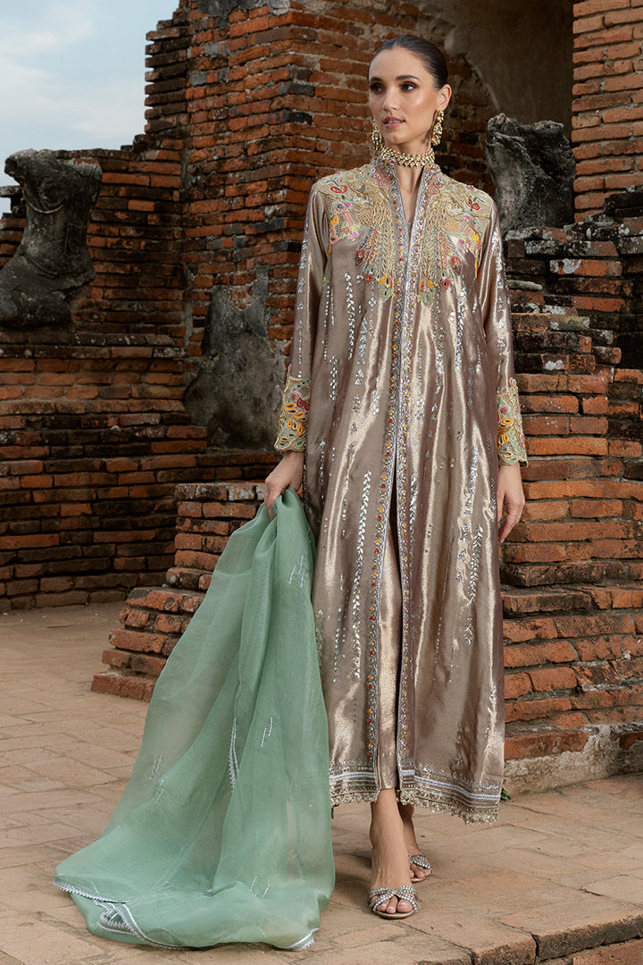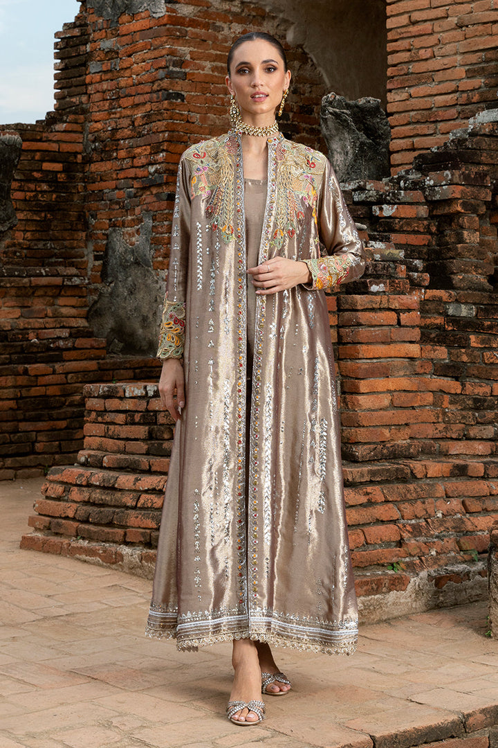 Geometric precision meets floral vibrancy in this ankle-grazing jacket. Crafted from pure metallic silk in a pale bronze tone, it is enlivened by silver and gold zardozi embroidery tracing geometric trails along the length and sleeves. In contrast, bursts of jewel tones in hand embroidered resham florals and vines brighten the neckline and sleeves. The rich detailing on the hem and jacket opening, and the scattered kamdani adds to its glimmering appeal. Paired with matching separates, the result is a layered design story both bold and intricate.