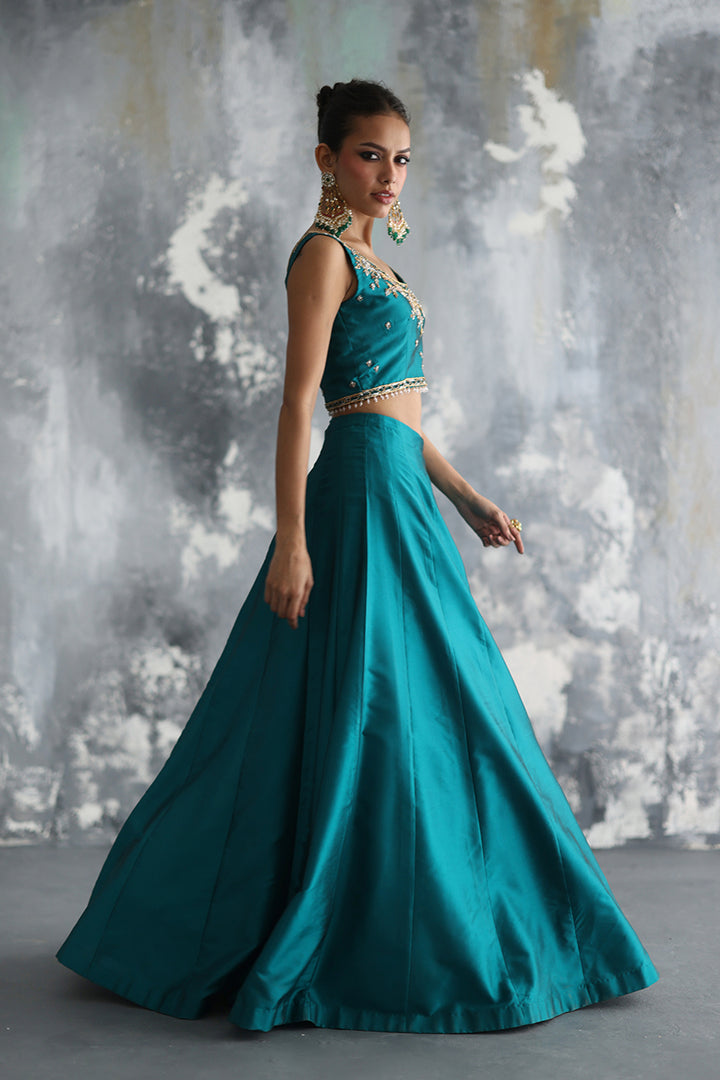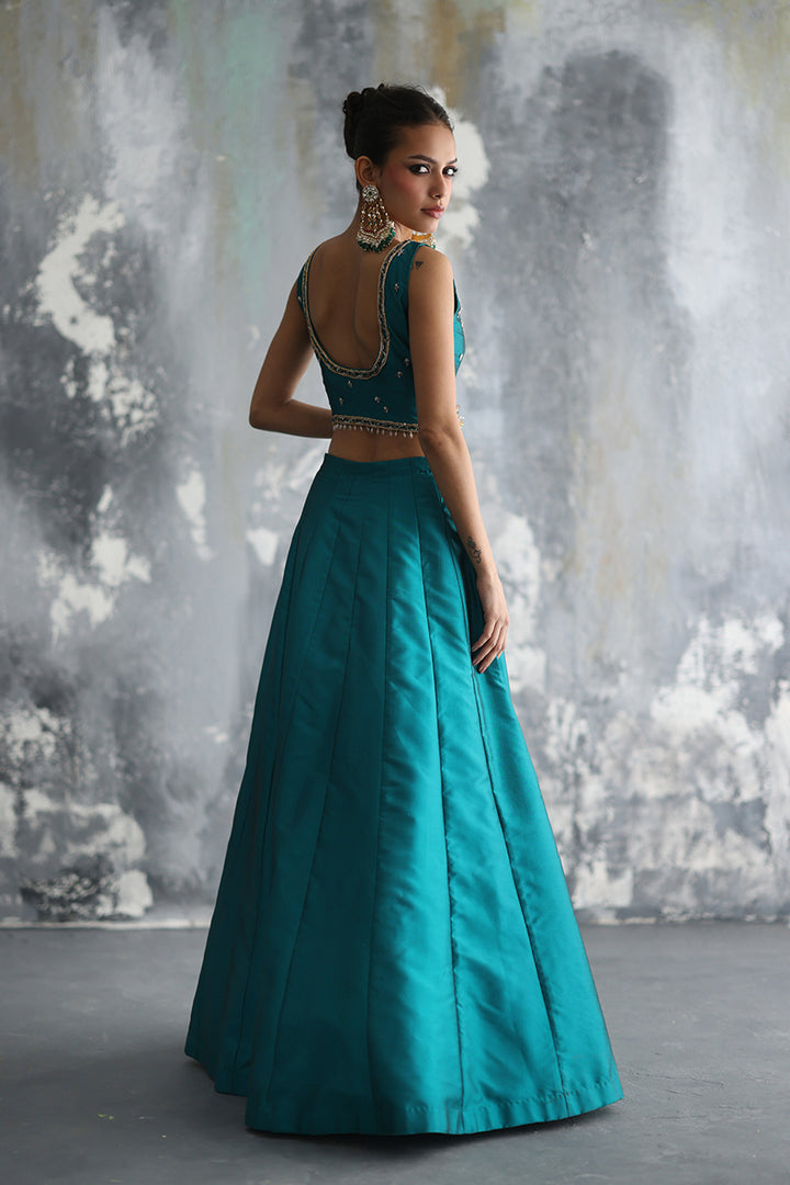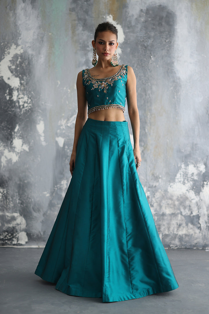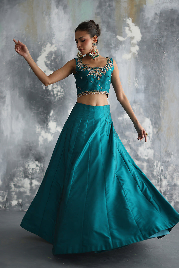 A celebration of handwork and hue, this teal katan silk set finds its beauty in minimalism. The blouse’s neckline and hem are meticulously traced with hand- done zardozi, kamdani, and sequin detailing in silver, gold, and copper. The floral vines that bloom on the bodice are rendered with couture precision, while crystal drops on the hem add gentle light. The paneled lehnga in matching katan silk completes the look — flared, balanced, and radiant with artisanal flourish.