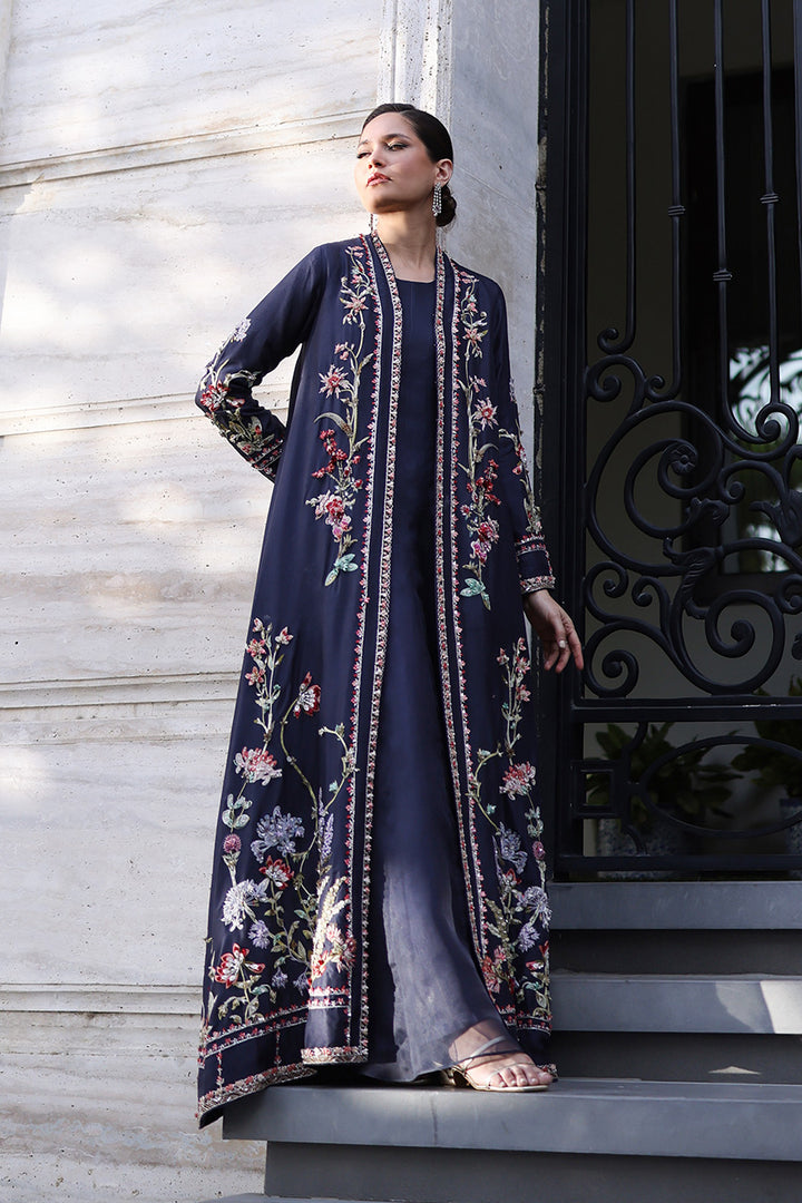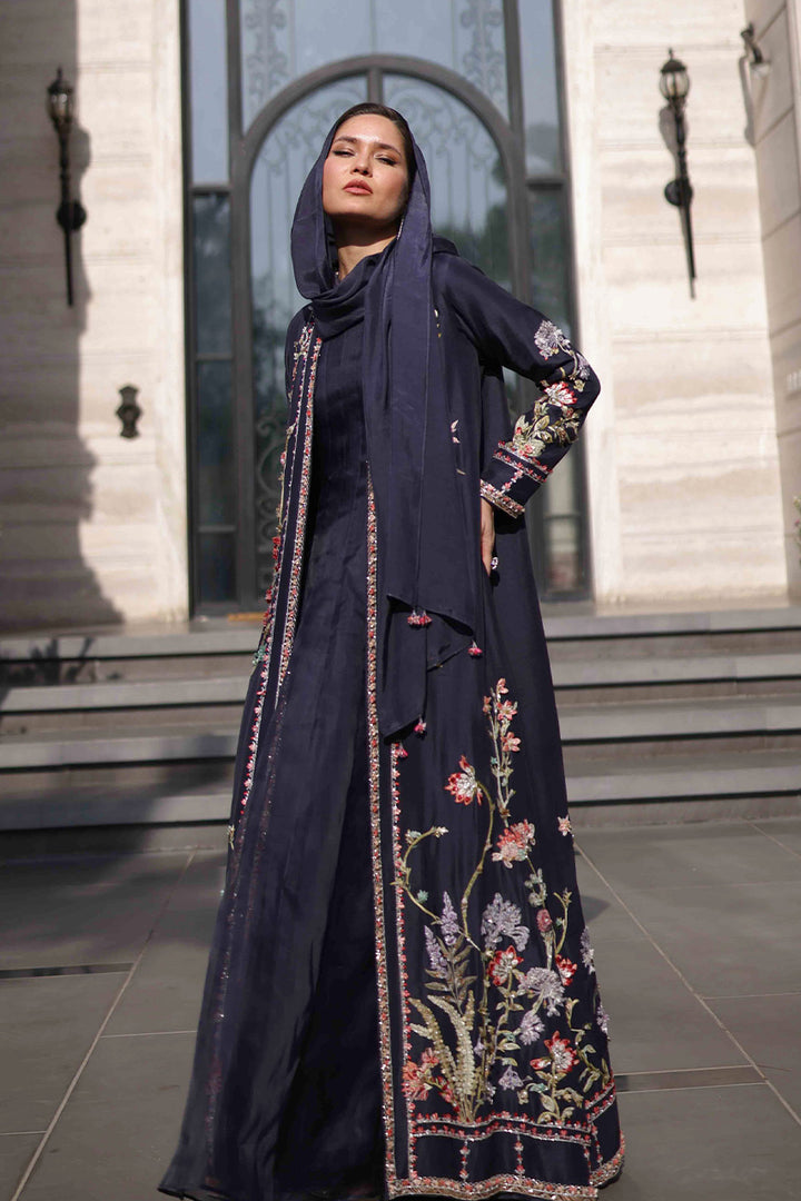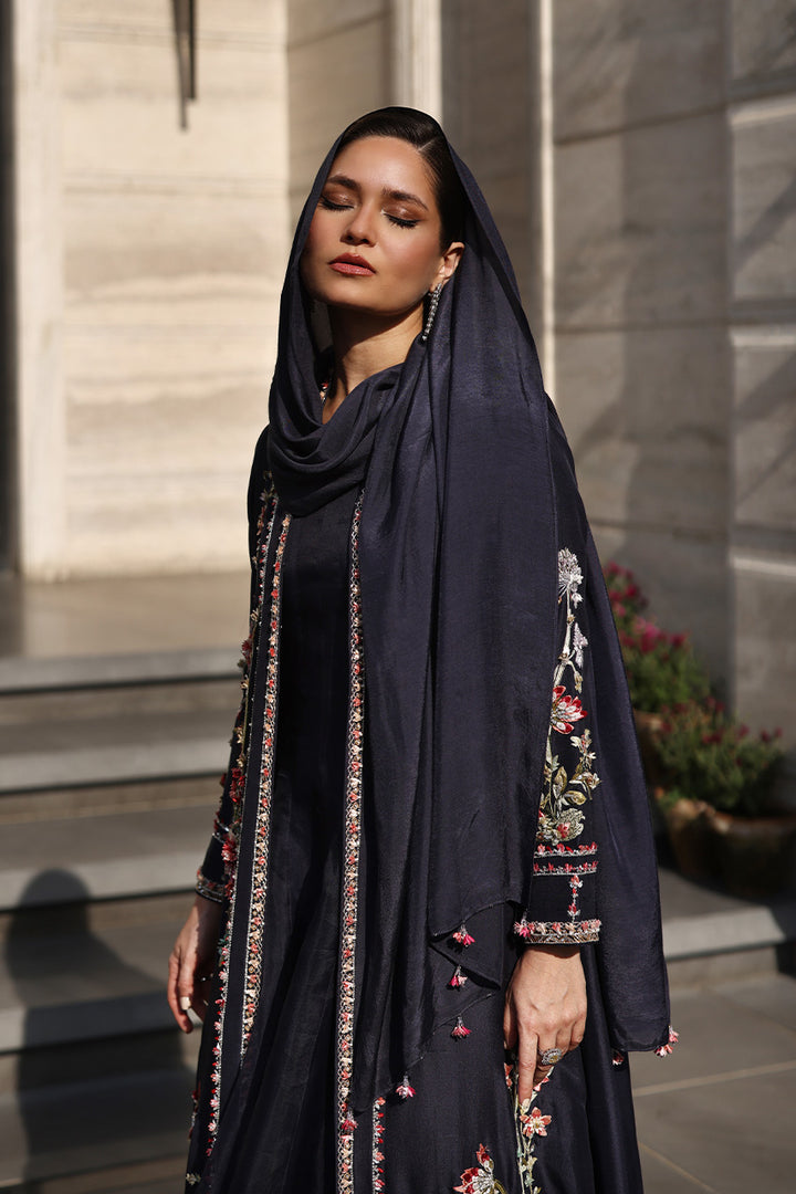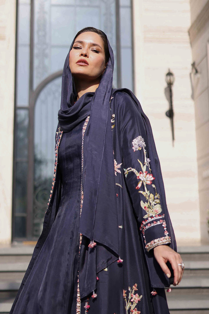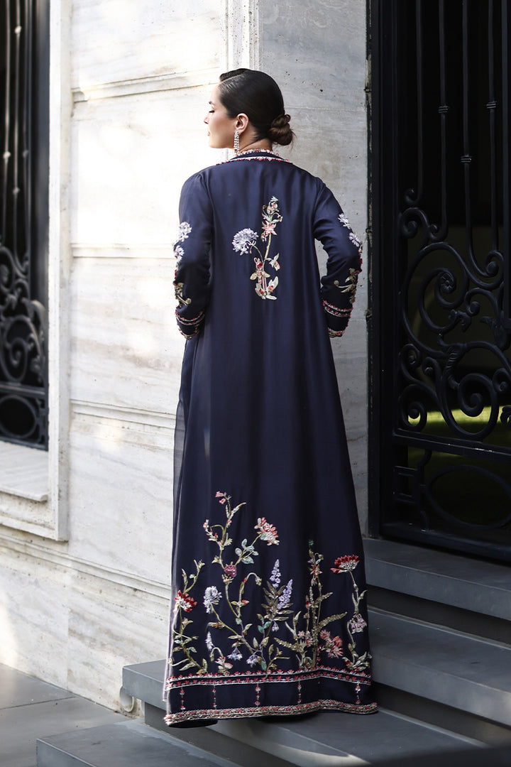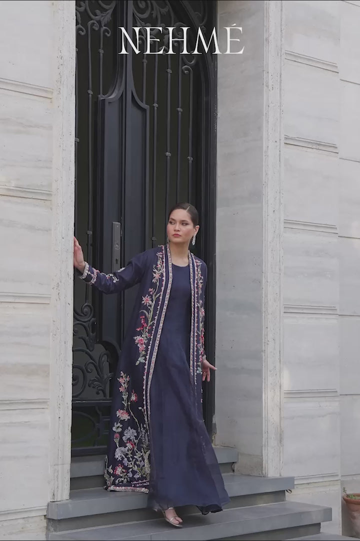 The depth of charcoal grey transforms into a stage for light and color. On the pure silk jacket, aari embroidered vines and florals bloom in summer hues, layered with sequined and crystalline spark. Each motif is a testament to intricate mastery and hours of skill, framing the silhouette in soft brilliance. The organza kalidar beneath tempers the richness with airiness, while the khaddi silk shella restores lustre. A tonal dialogue — shadow and shimmer in perfect balance.