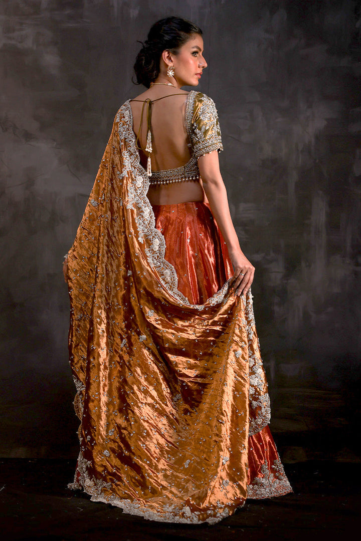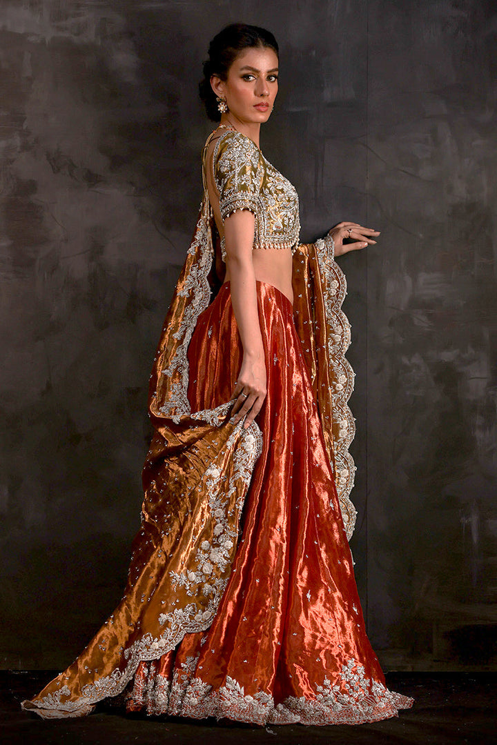 This delicately hand-worked zardozi, resham, vasli and kamdani in pretty florals and bird imagery on a kahi metallic silk choli with pearl hangings and french knots is paired with a rust metallic full gold zardozi and kamdani work silk lehnga and copper metallic silk dupatta heavily worked in zardozi and resham.