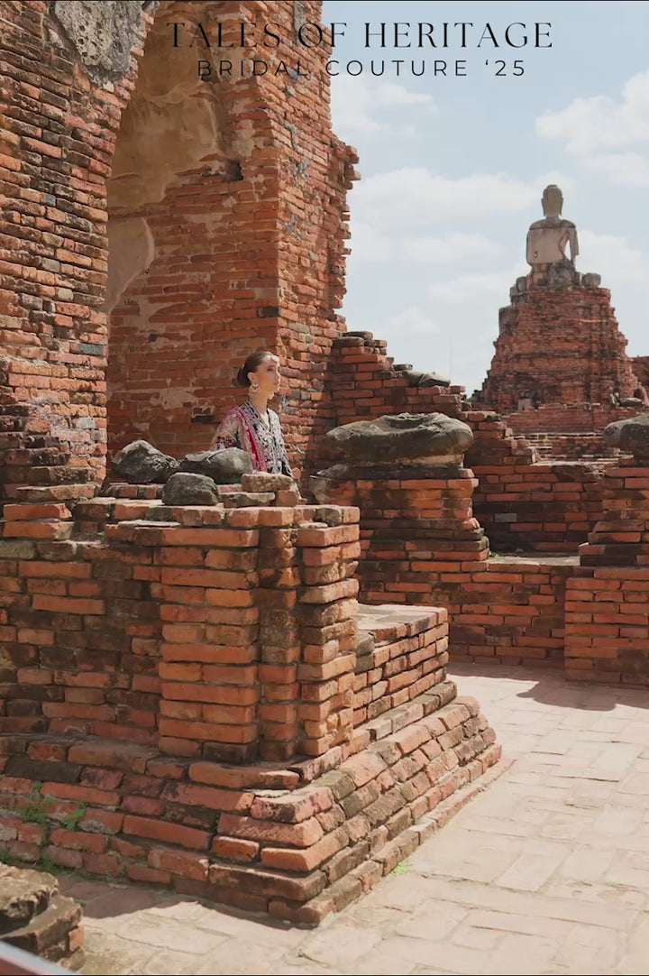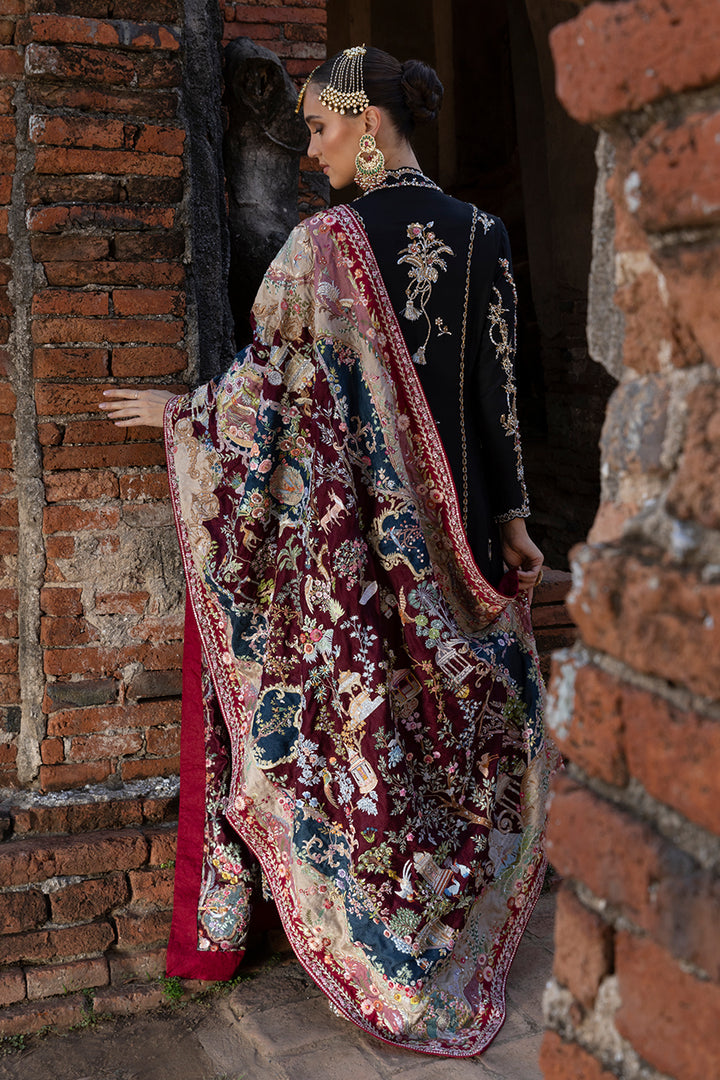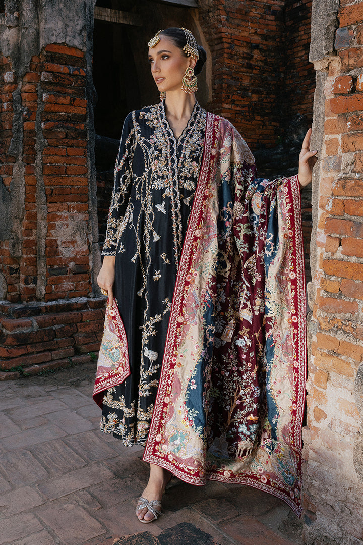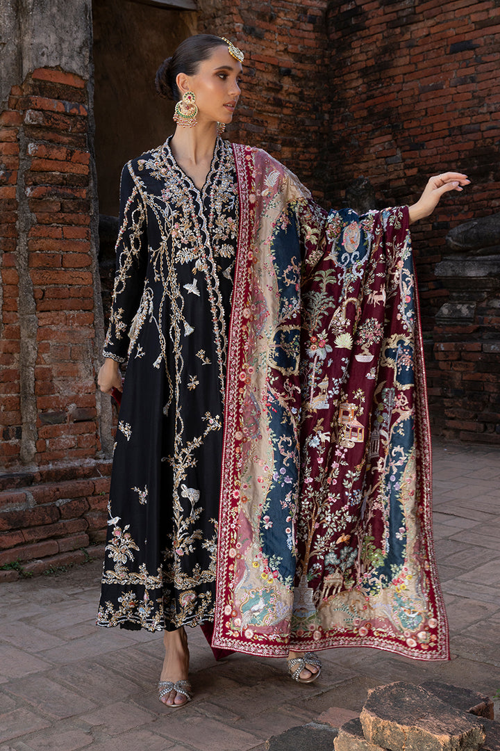 French florals inspire this pure silk chogha, reimagined on a dramatic black canvas. Zardozi in silver and gold, softened with pastel resham detailing, blooms into graceful bouquets and winding vines, punctuated by avian accents. The ornate sleeves and cutwork enriched hems glimmer with artisanal detailing, underscoring its delicate femininity. Tassels of zari and crystal add more drama, echoed in the sheer, lightly embellished organza dupatta. Silk straight pants keep the silhouette balanced, letting the chogha take the spotlight. A study in softness and refinement, this is a look that will resonate across seasons and celebrations.