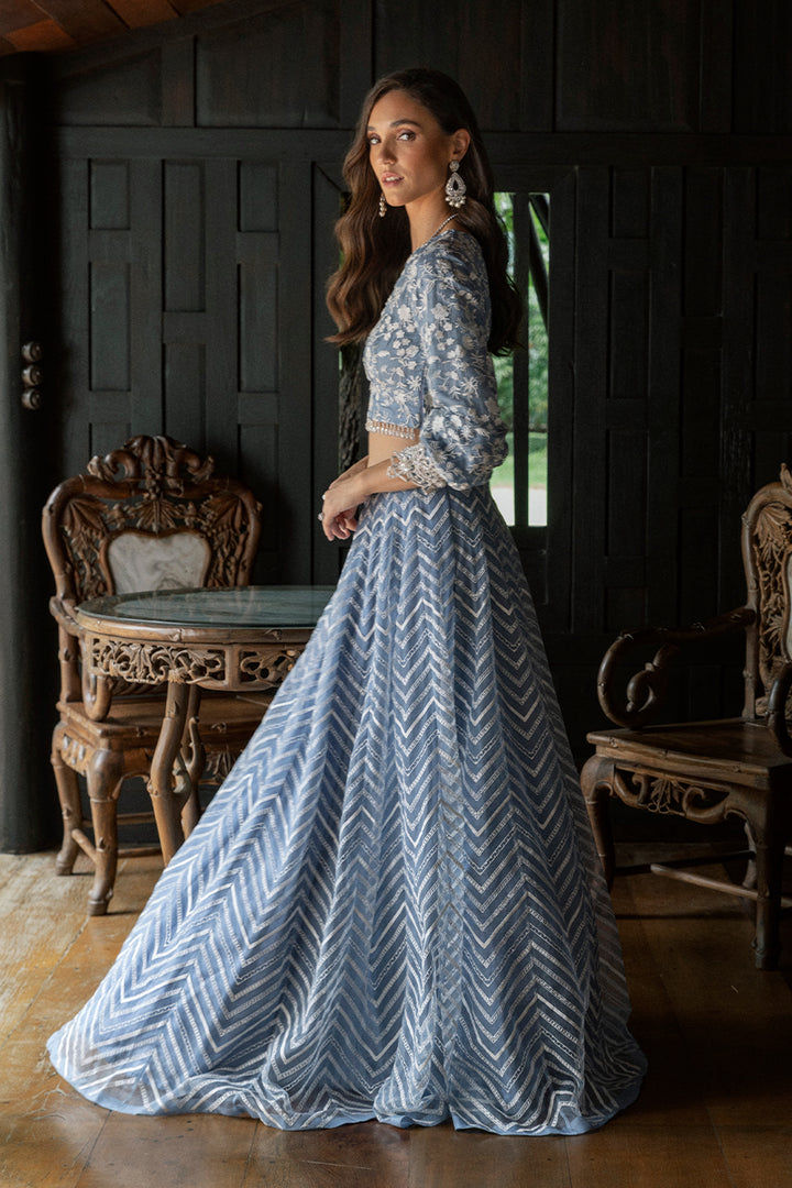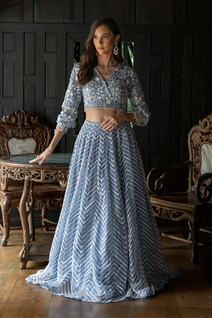 Attention to silhouette defines this pairing as much as embellishment. The blouse, in cornflower blue organza, is embroidered in a delicate web of white florals, its surface alive with finery. The wraparound neckline subtly sculpts, while bishop sleeves add tempered volume. Hand worked details bloom with silver zardozi, sequins, and beadwork for a textured crescendo on the cuffs. Crystal tassels fringe the hemline, adding another whisper of shimmer. In contrast, the pooling skirt emphasizes clean lines, its paneled length embroidered with detailed white chevrons that elongate and sharpen the silhouette. Altogether, the organza ensemble carries a cut that flatters, a craft that elevates, and a composition that moves with poise.