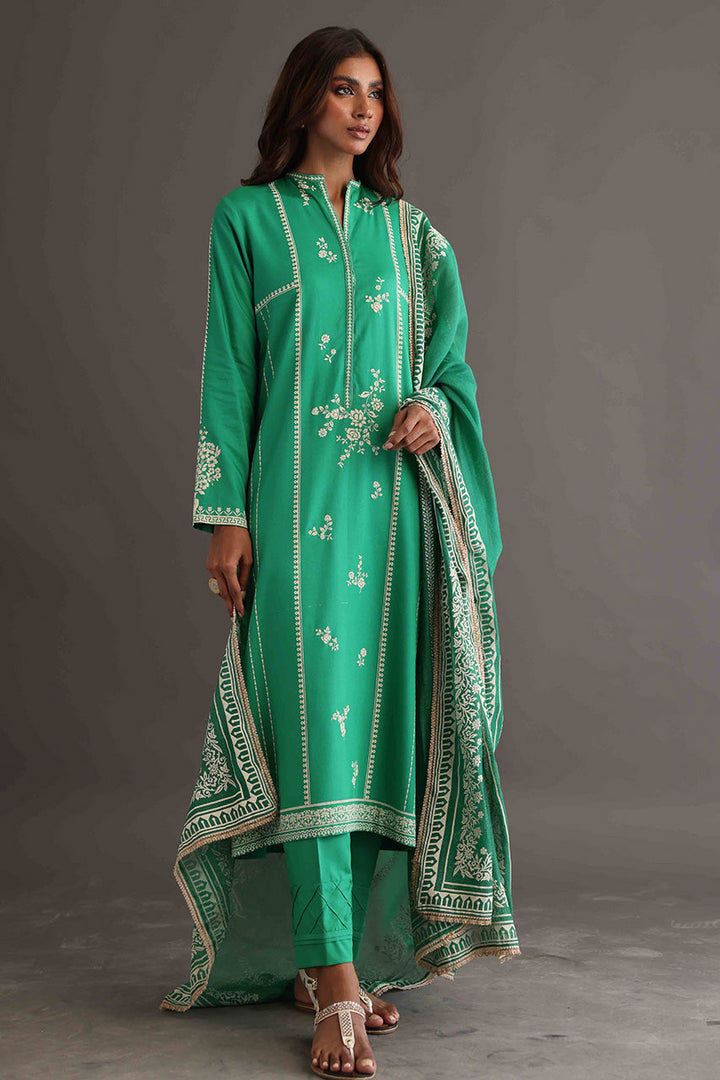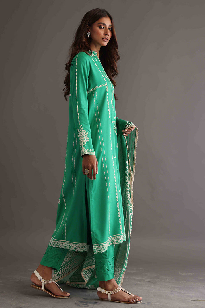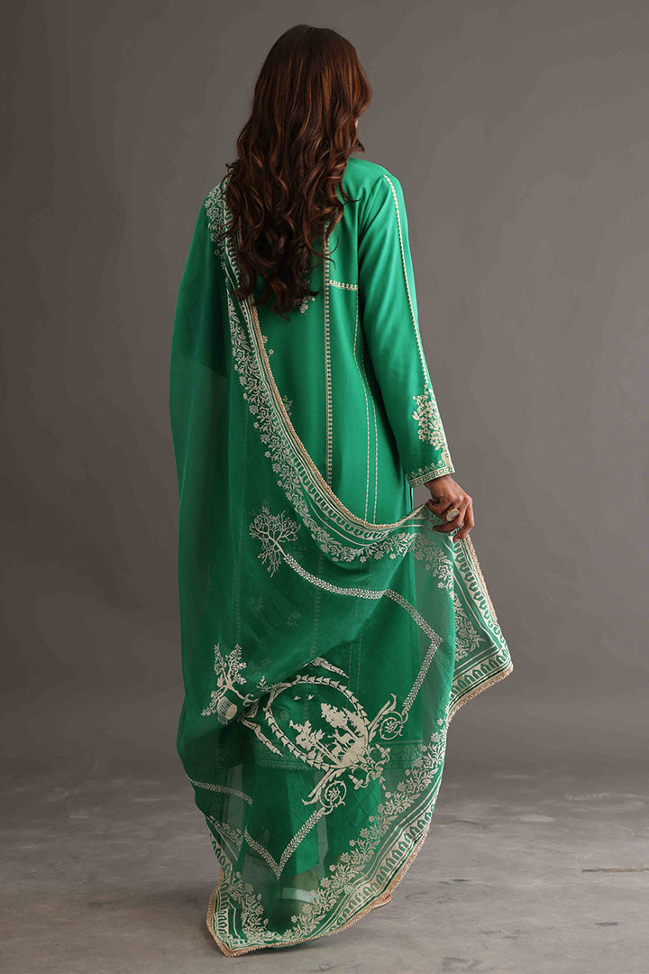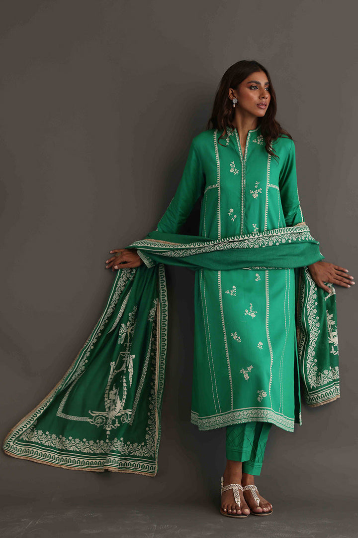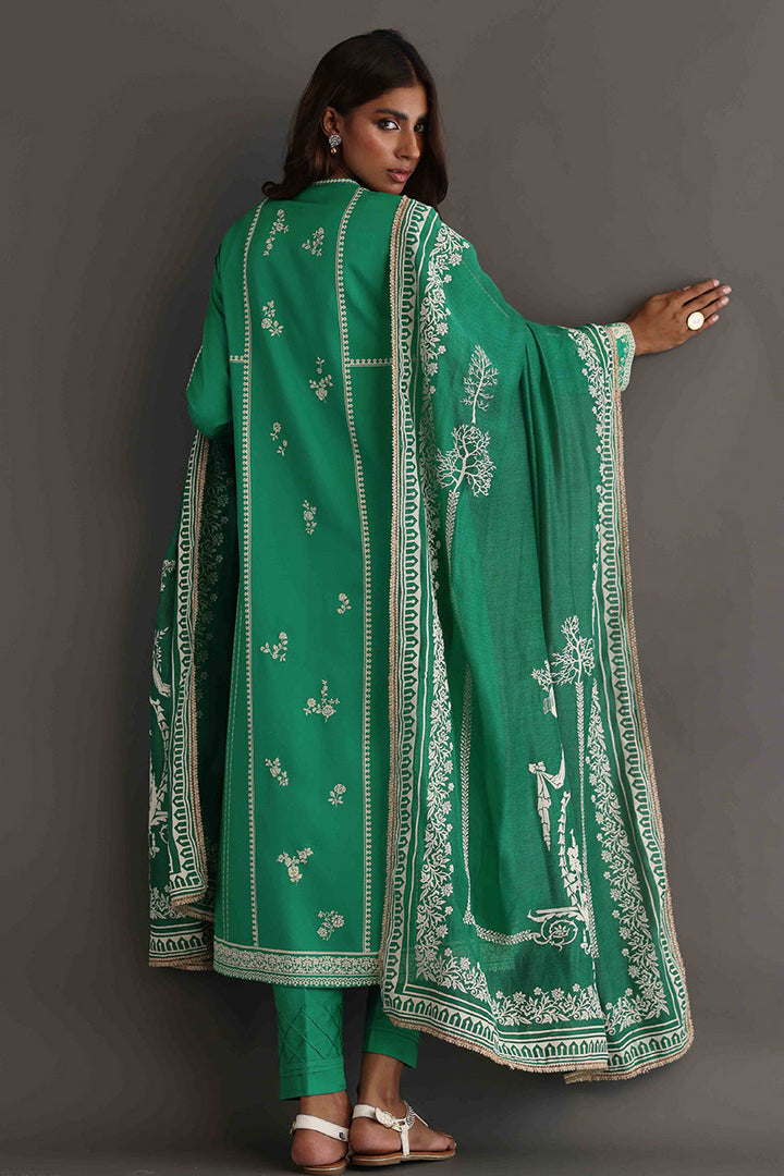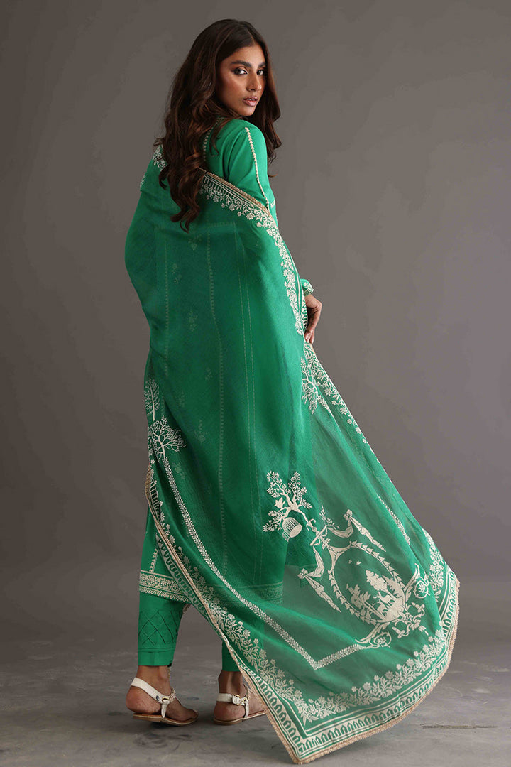 These beautiful Lauren green linen shirt and pants is the season favorite! With our signature off-white screen-printing to complimenting cotton net dupatta in a darker shade of green, finished with gold borders!