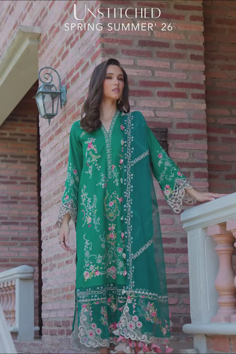 A vivid garden blooms across emerald green premium lawn. Petal-hued florals and beige geometries adorn the shirt fabric in a symmetrical harmony. A delicate trim for the neckline, and intricate organza panels for the hem and sleeves take the flair for details further. Solid matching bottoms, paired with embroidered organza borders, and an emerald organza dupatta, embroidered with delicate florals and soft geometries, complete the look.