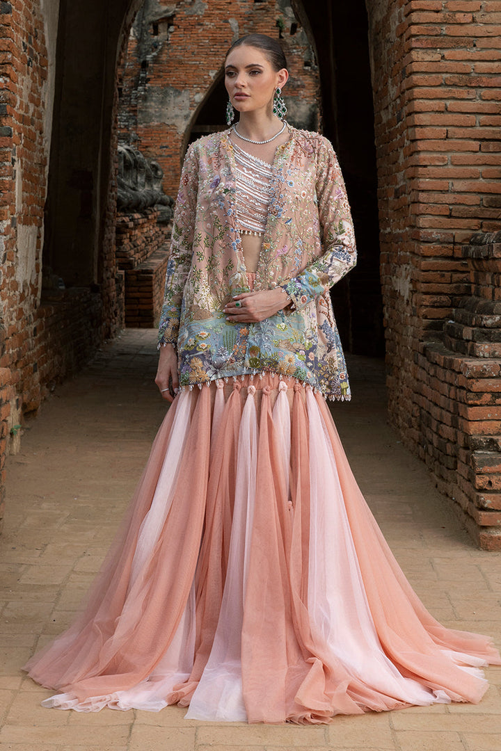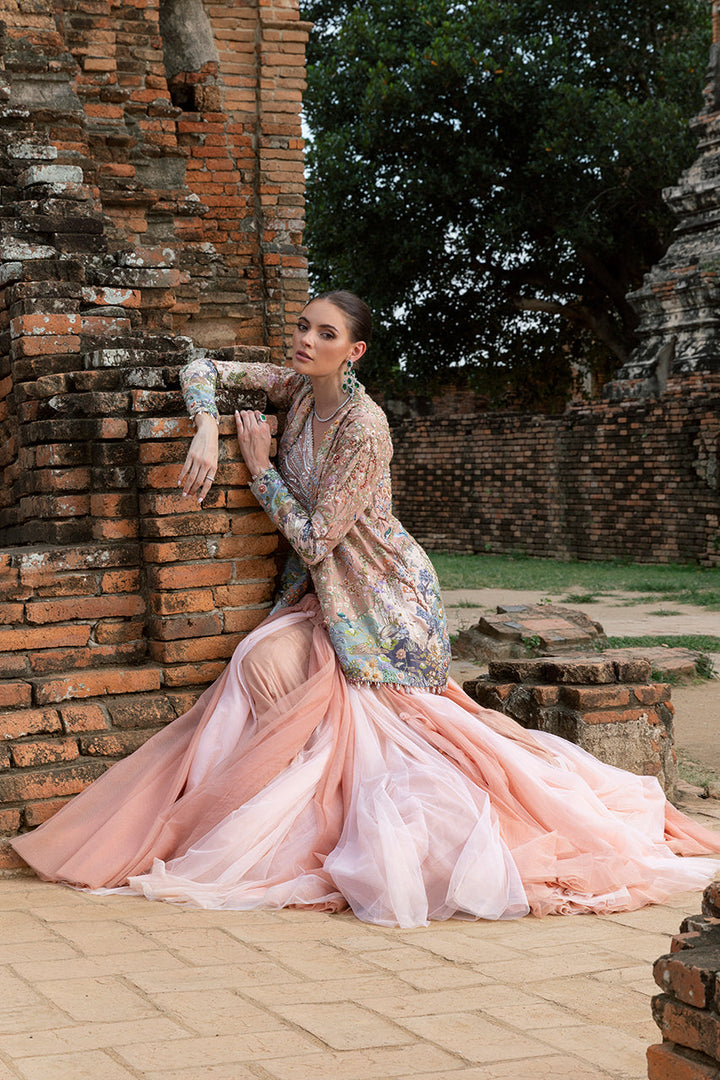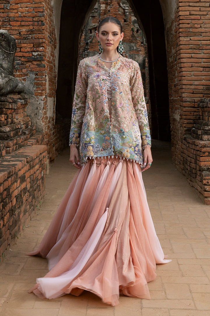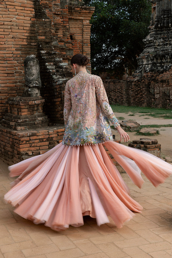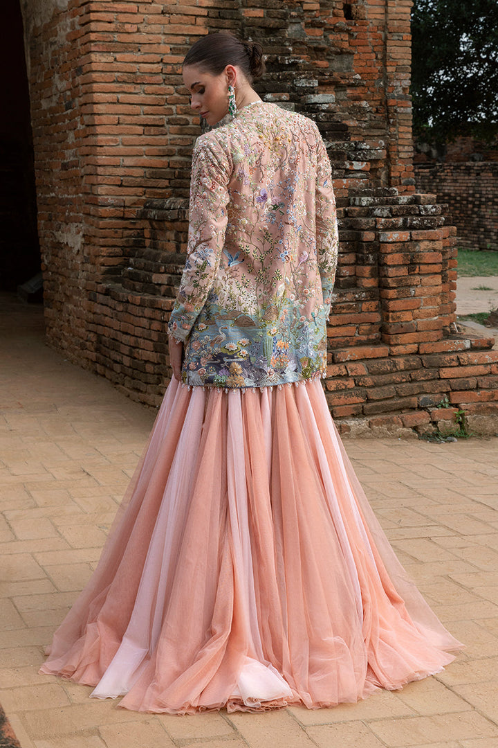 This couture ensemble draws on the lyrical elegance of chinoiserie. The pale terracotta raw silk jacket, A-line in form, is richly hand-embroidered with resham florals and motifs in soft blues, greens, and beige, brought to life with delicate embellishments. Crystal fringe edges its hems and sleeves, catching light with every movement. Worn over an asymmetrical one-shoulder blouse in pleated net, encrusted with crystals, beads, sequins, and finished with pearl drops, the look finds its anchor in a two-tone peach knotted skirt in sheer soft net. Together, the palette of terracotta, blush, and blue creates a vision that is both painterly and ethereal.