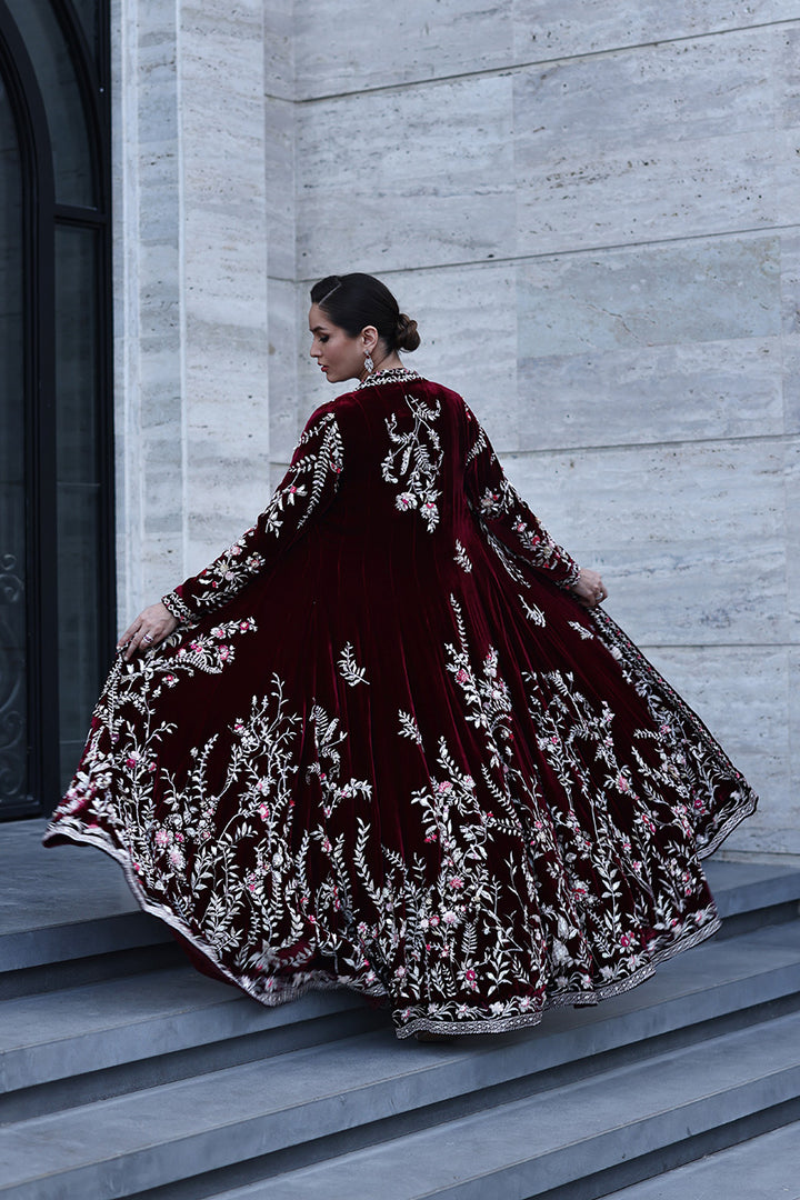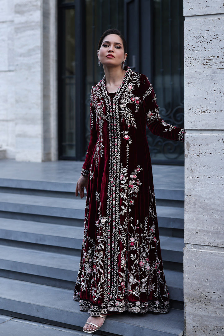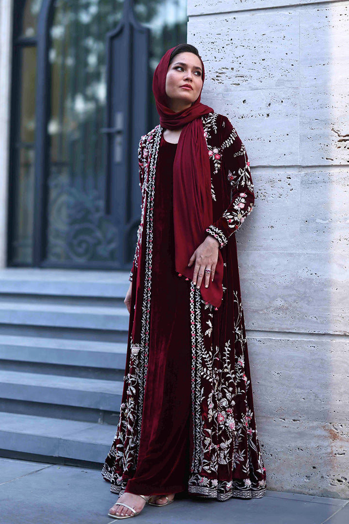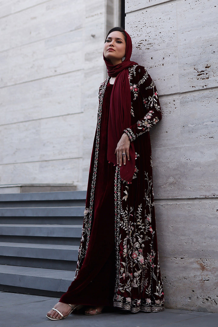 In maroon’s deep resonance, hand-embellished details and sparkling contrasts bloom. On plush velvet, flowering tendrils meander the length and sleeves, while intricate patterns line the edges. Embossed screen-printing meets hand-placed sequins, beads, and crystals, bringing silver shimmer and blushing texture to the regal canvas. The matching velvet kaftan adds quiet continuity, while the maroon chiffon shella adds another layer of softness. The look, a study in tonal layering, evokes warmth, depth, and enduring presence.