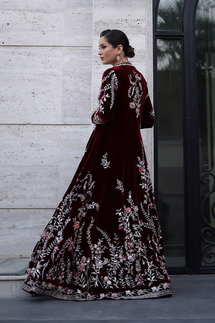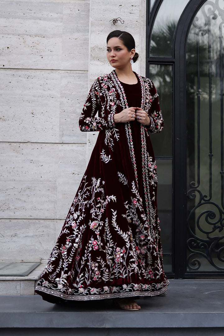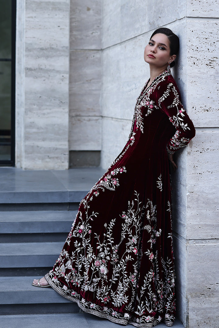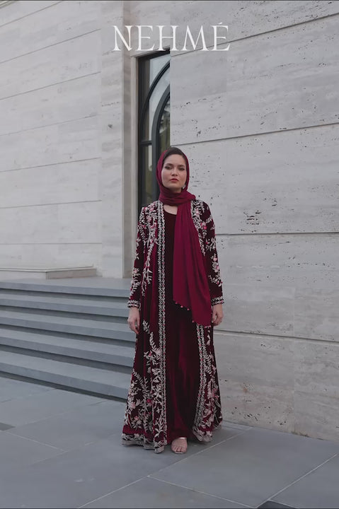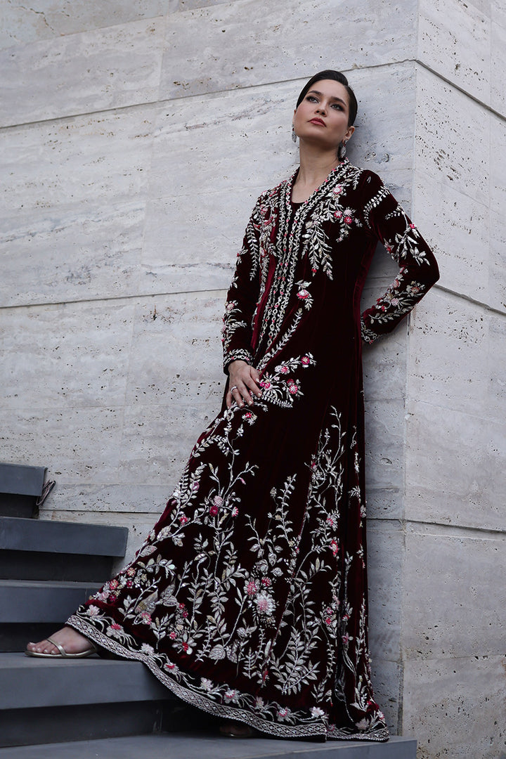 In maroon’s deep resonance, hand-embellished details and sparkling contrasts bloom. On plush velvet, flowering tendrils meander the length and sleeves, while intricate patterns line the edges. Embossed screen-printing meets hand-placed sequins, beads, and crystals, bringing silver shimmer and blushing texture to the regal canvas. The matching velvet kaftan adds quiet continuity, while the maroon chiffon shella adds another layer of softness. The look, a study in tonal layering, evokes warmth, depth, and enduring presence.
