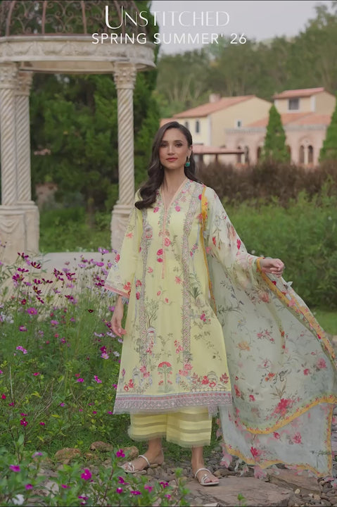 An ode to imperial gardens unfolds across lemon yellow premium lawn. Intricately embroidered Mughal-inspired motifs trace the length and sleeves. Finely embroidered organza border, for the hem and cuffs, frame the composition. Paired with matching solid fabric for the lowers and a pure silk dupatta carrying printed florals, this set is perfect for summer days and quiet festive moments.