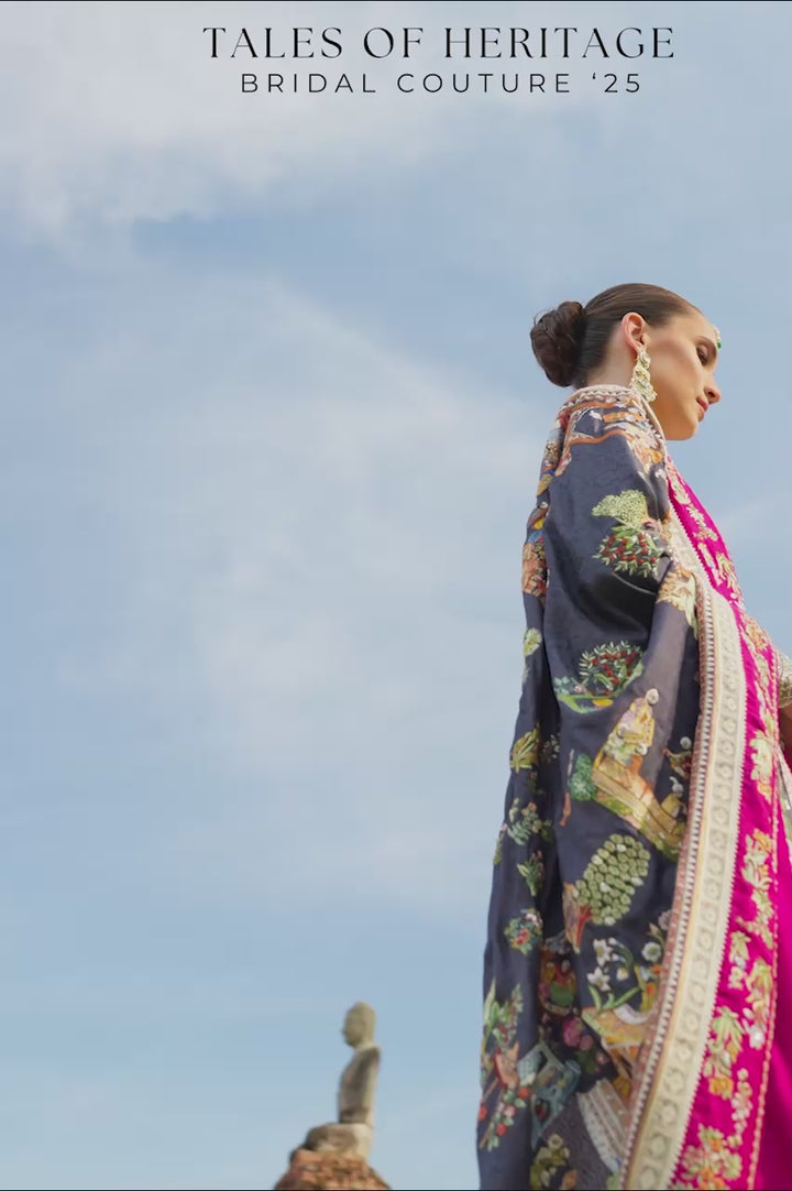 This chaddar reveals its beauty in framing and detail. Worked on charcoal grey jamawar, its expanse adorned with Mughal-inspired motifs rendered in aari embroidery. Fine resham threads in vibrant tones animate the forms, their richness glowing against the dark base. Encircling the piece, hot pink embroidered borders create a continuous rhythm of ornament. At the four corners, turquoise appliqué breaks the symmetry with bold flourish. This balance of order and punctuation makes the chaddar both striking and meticulously finished.