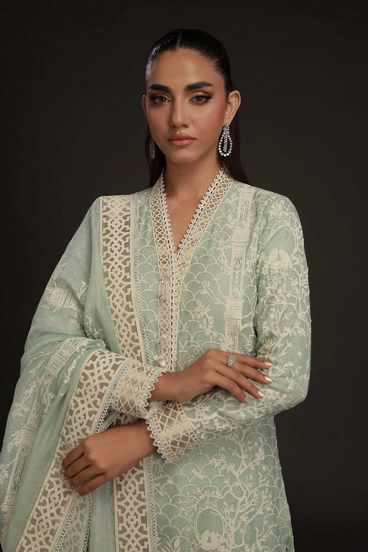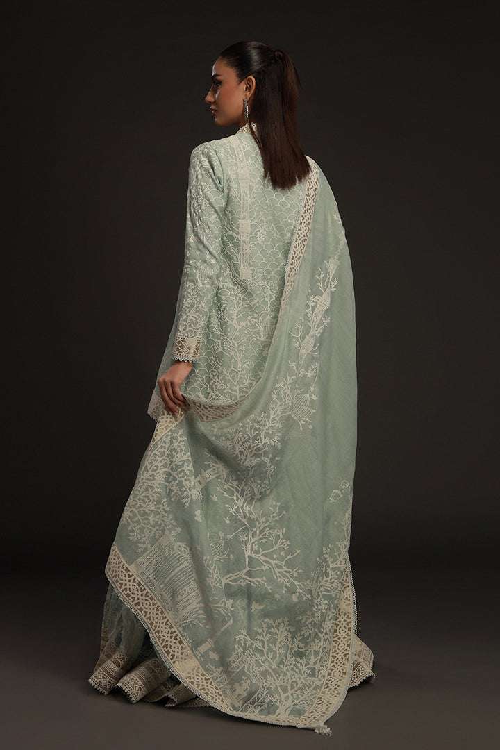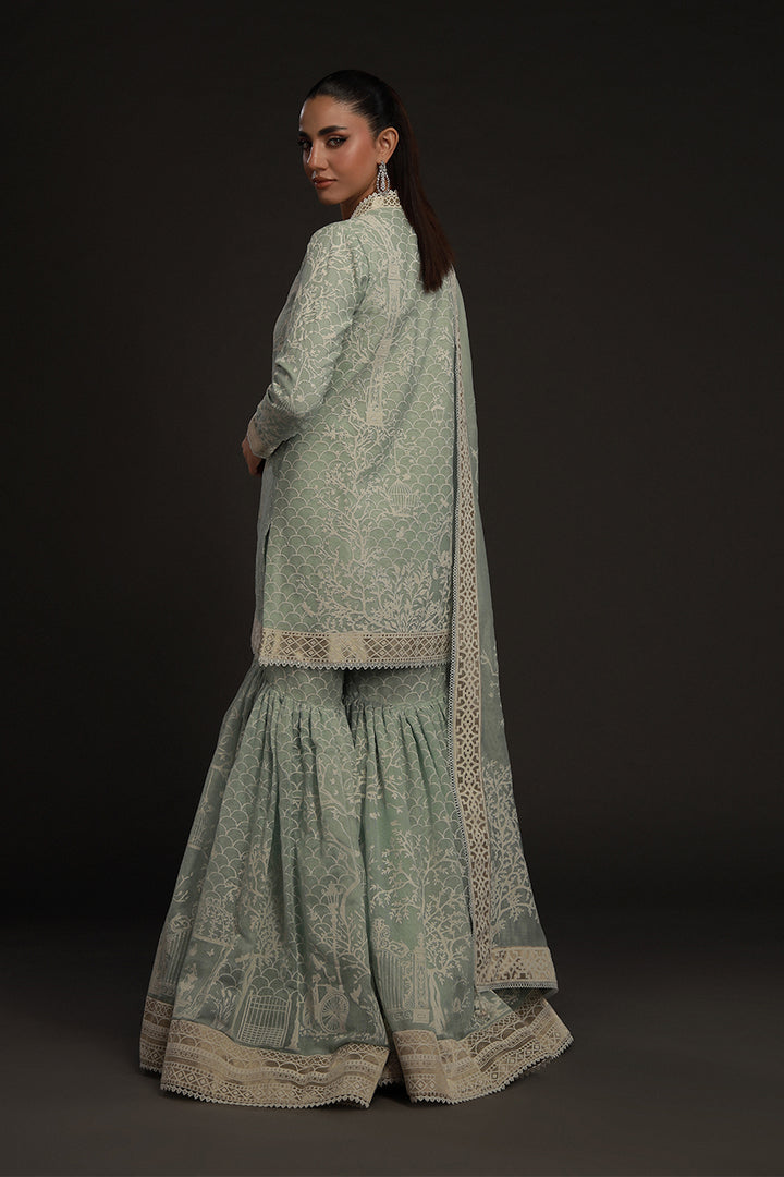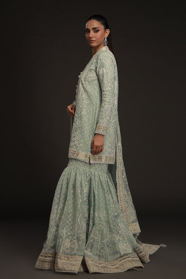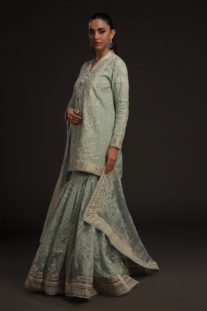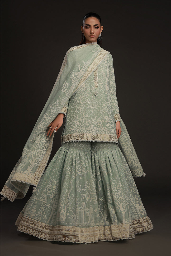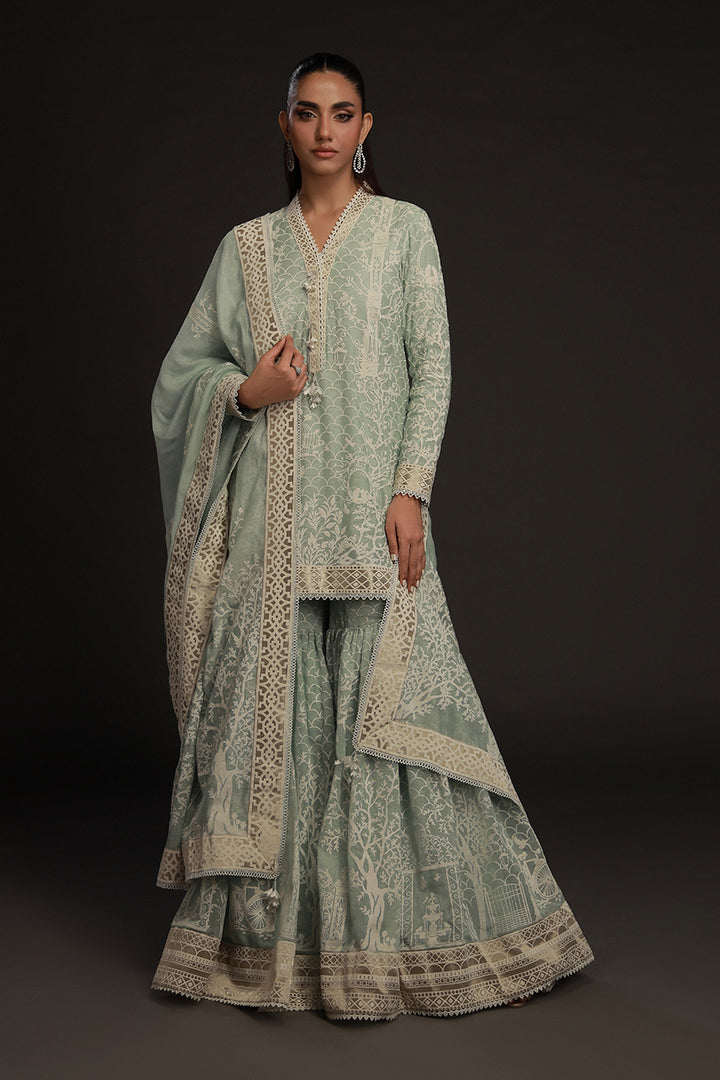 Like stepping into an enchanted garden at dawn, this three-piece look feels lush yet light. The short mint cotton net shirt is drenched in dainty white screen prints delicate vines, florals, and garden motifs that tell a story across its surface. Gold tissue borders frame the sleeves, hem, and neckline, while handdone accents add a quiet dimension. The voluminous gharara continues the screen-print, its wide hems finished with tissue borders that glint softly. The dupatta offers pause, its pallus screen-printed to echo the set and edged in gold tissue to tie it all together.