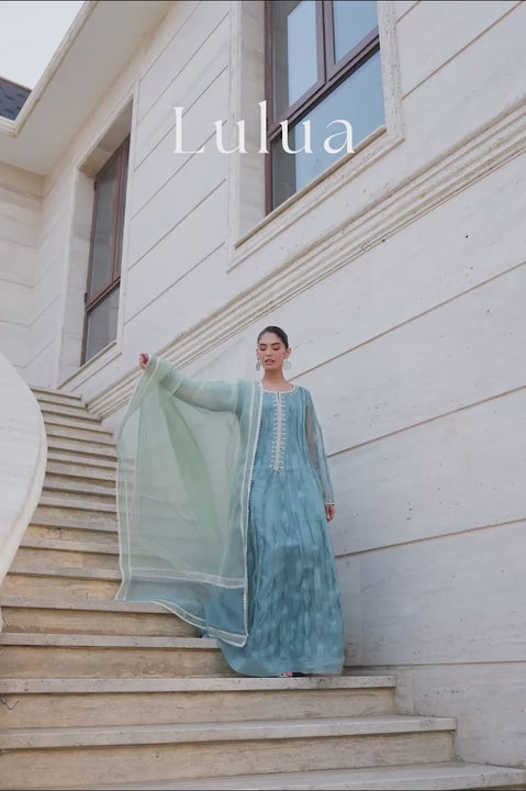 This blue vision is shaped through movement and texture. The old blue organza kalidar flows with vertical pleats that animate its length, while delicate floral details trace the neckline and sleeve cuffs. Sparkling sequins, zardozi, beads, and crystals lend it a soft glimmer, allowing the fabric’s lightness to remain intact. A sage green organza dupatta completes the look, finished with pleats and white trims along the borders and pallu, edged with old blue panels to echo with the kalidar.