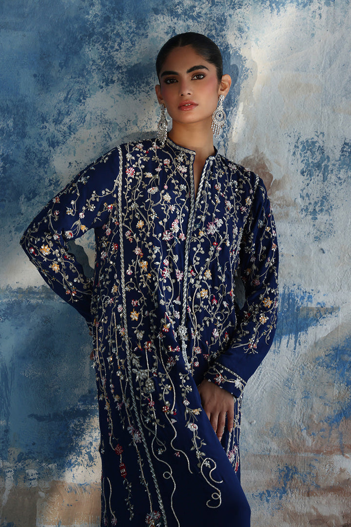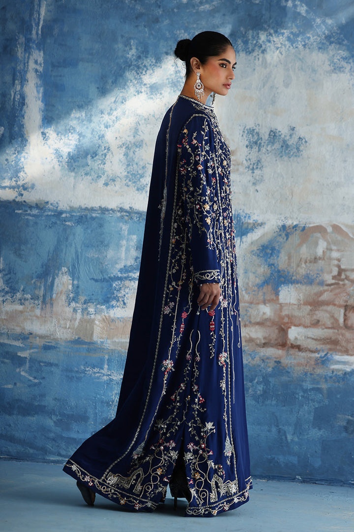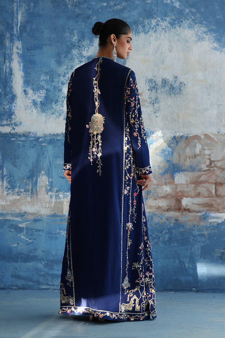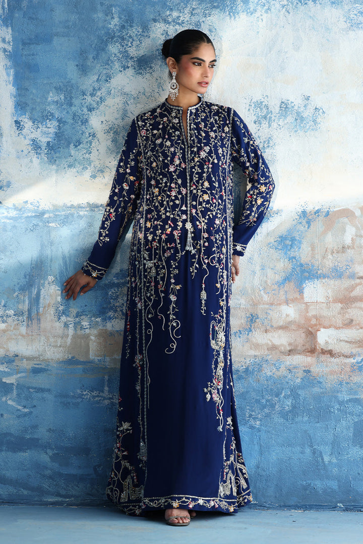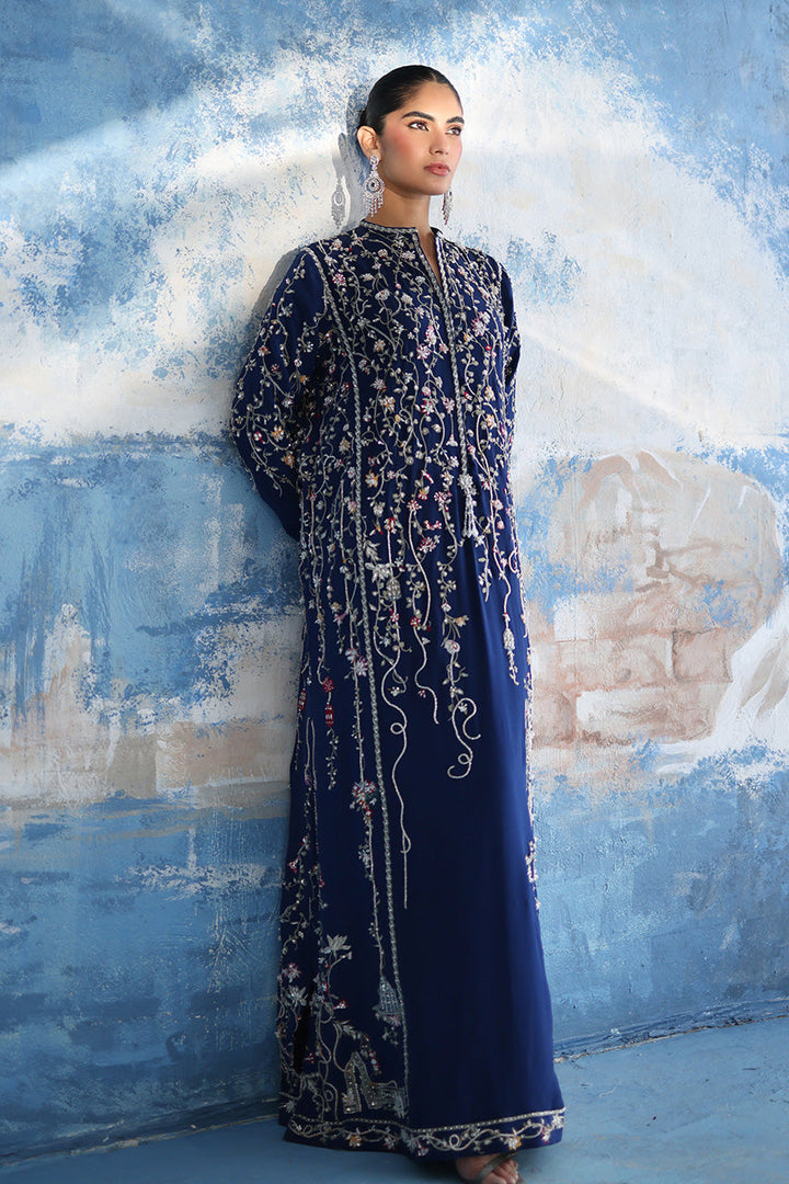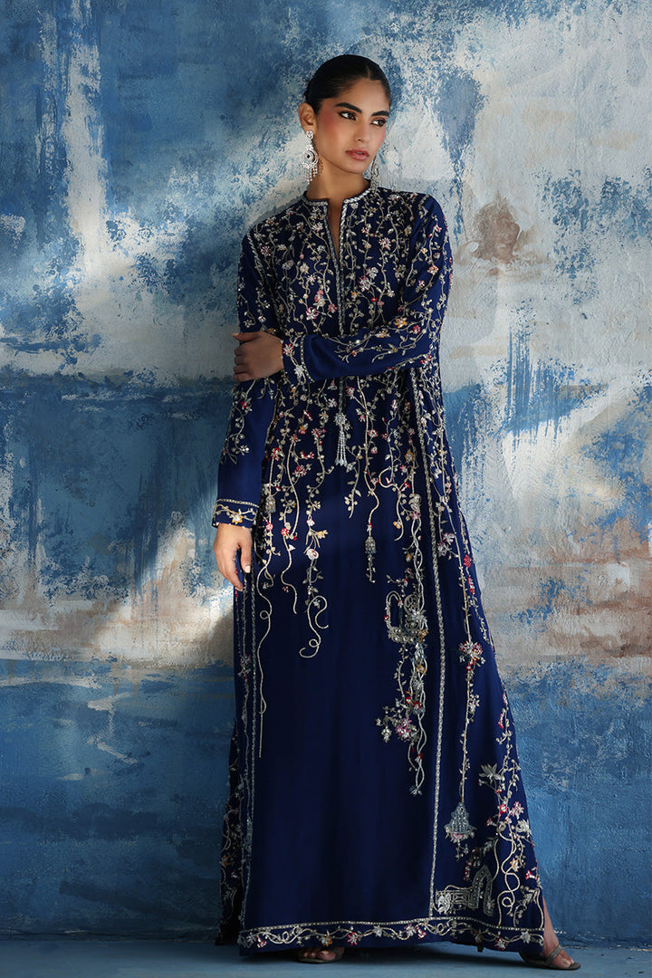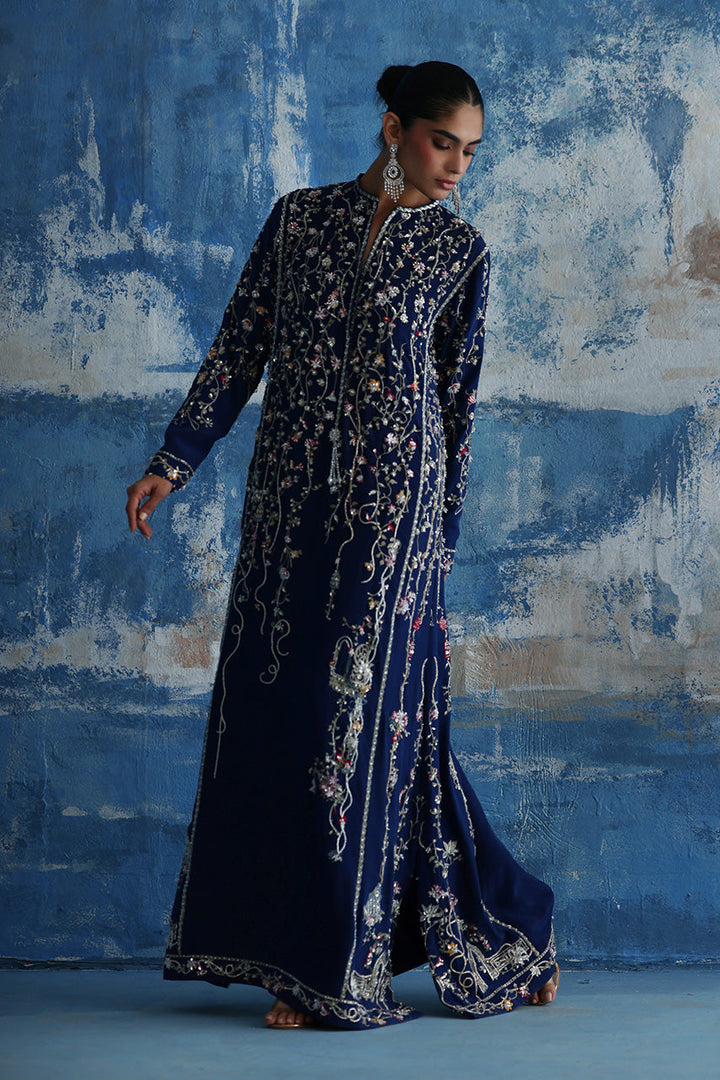 Introducing an exquisite pure crepe silk kaftan in a deep navy base, adorned with intricate motifs inspired by the beauty of floral gardens. Delicately embroidered with fine Resham threads, the kaftan is further elevated with hand-embellished details, including shimmering crystals, sequins, beads, and lustrous pearls. This luxurious piece blends elegance with artistic craftsmanship, making it a timeless addition to any wardrobe. Perfect for those seeking sophistication and grace