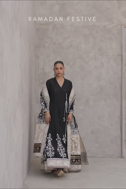 Delivery in 2-3 WeeksCut from black kora, this floor-length angrakha carries symmetrical floral screen prints along the hem and sleeves in crisp monochromes. Screen-printed gold tissue borders at the hem and cuffs bring a soft celebratory glow, complemented by beaded accents along the neckline and wrap seam, and floral tassels at the front. Elongating the form, matching kora churidar pants stay true to tradition. A black swiss voile dupatta completes the set, framed with screen-printed panels of organza and gold tissue, blossoming with layered contrast. Perfect for evenings and festive occasions where relaxed elegance is the brief.