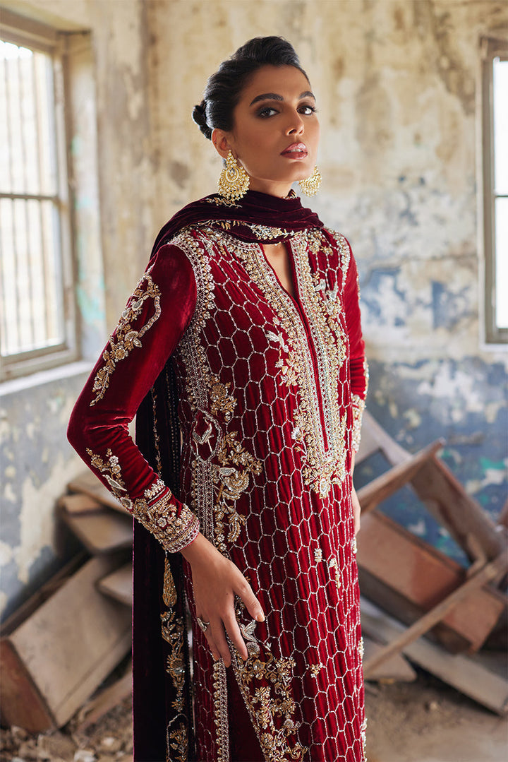 Introducing Musfirah, a traditional velvet kurta inshades of red gracefully hand embroidered withintricate gold and silver work. It is paired with amatching velvet Izaar, adorned with intricate zardoziwork. A dark maroon velvet dupatta with delicatehand embroidery completes this ensemble . Thisoutfit embodies classic charm and sophistication