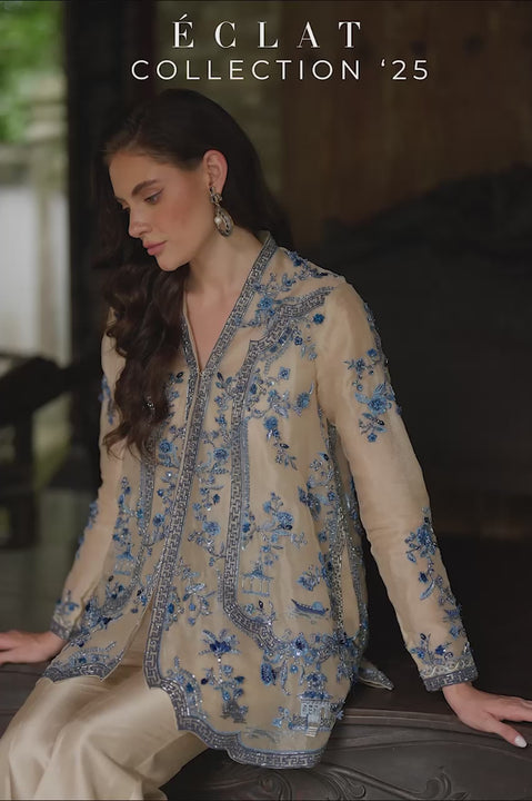 This look finds beauty in the meeting of textures. The organza jacket, airy yet commanding, is embroidered in shades of blue, with blossoms and motifs traced across its surface with painterly intent. Beads, sequins, and silver zardozi shimmer within the detailing, while three-dimensional blossoms give the jacket a sculpted tactility. A scalloped hem completes the rhythm of craft. Underneath, a solid camisole in khaddi silk provides smooth contrast, its simplicity key to the layering. The pure raw silk pants flare softly at the knee, their bootcut lines sharpening the silhouette. Tactility of the details, elevates this look into something truly special.