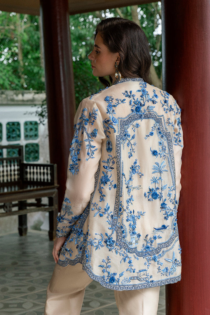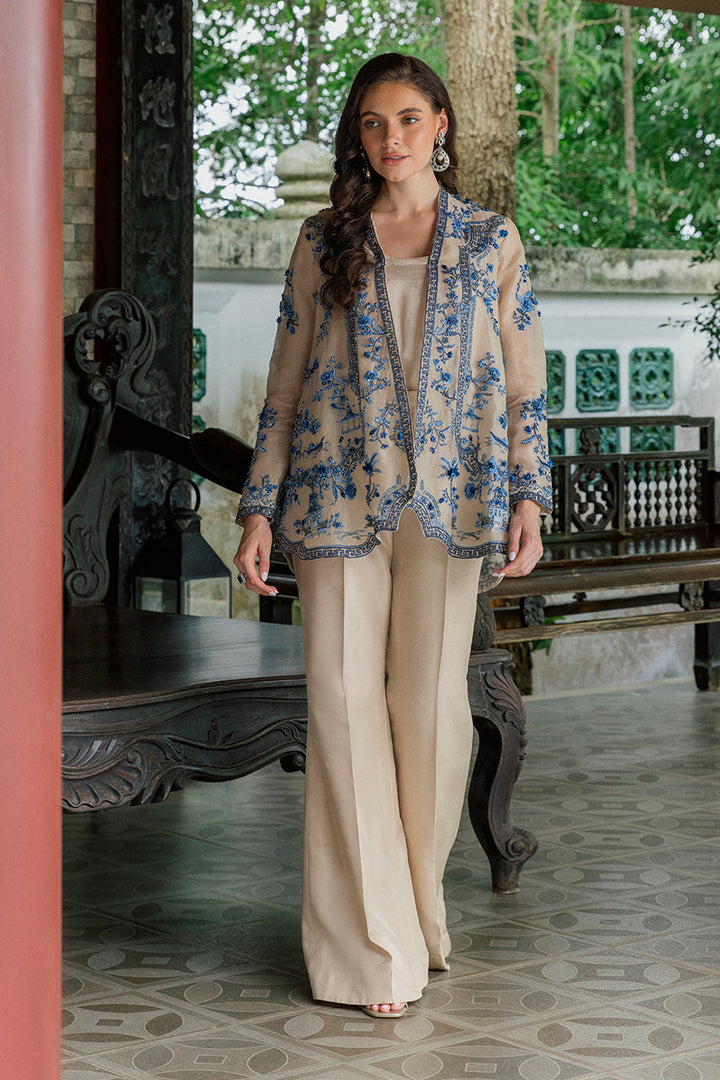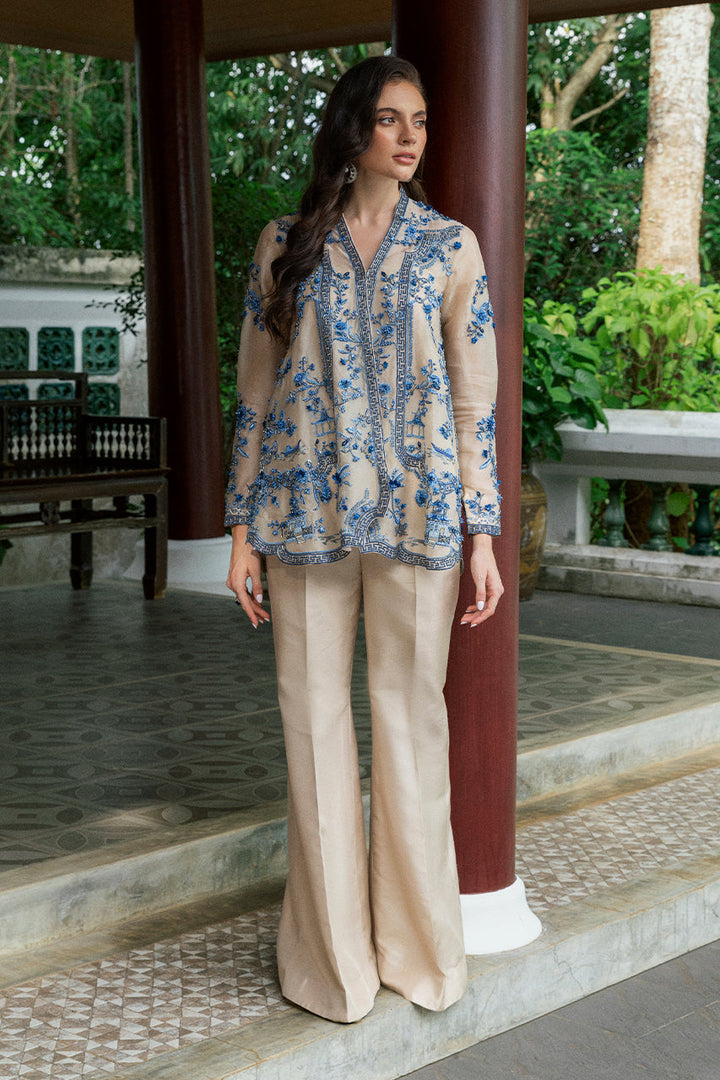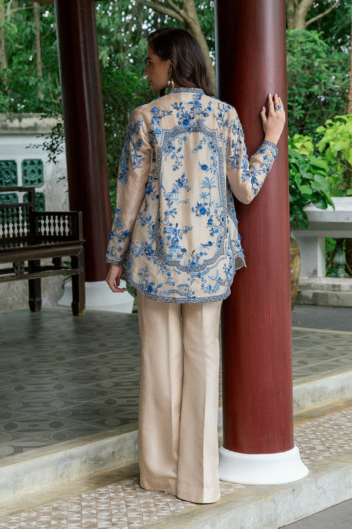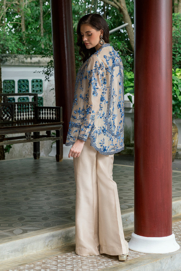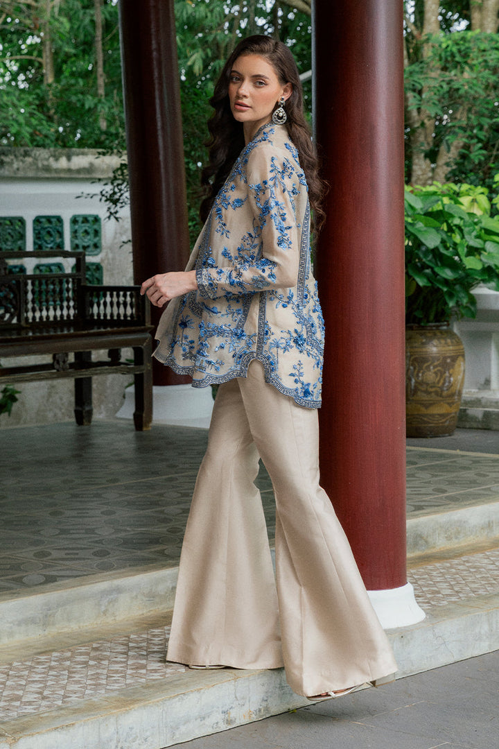This look finds beauty in the meeting of textures. The organza jacket, airy yet commanding, is embroidered in shades of blue, with blossoms and motifs traced across its surface with painterly intent. Beads, sequins, and silver zardozi shimmer within the detailing, while three-dimensional blossoms give the jacket a sculpted tactility. A scalloped hem completes the rhythm of craft. Underneath, a solid camisole in khaddi silk provides smooth contrast, its simplicity key to the layering. The pure raw silk pants flare softly at the knee, their bootcut lines sharpening the silhouette. Tactility of the details, elevates this look into something truly special.