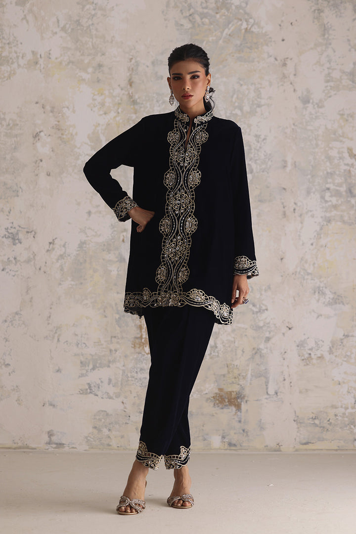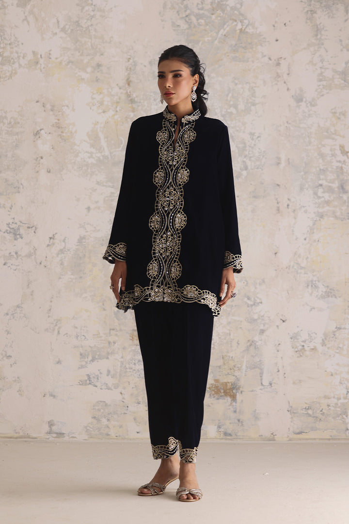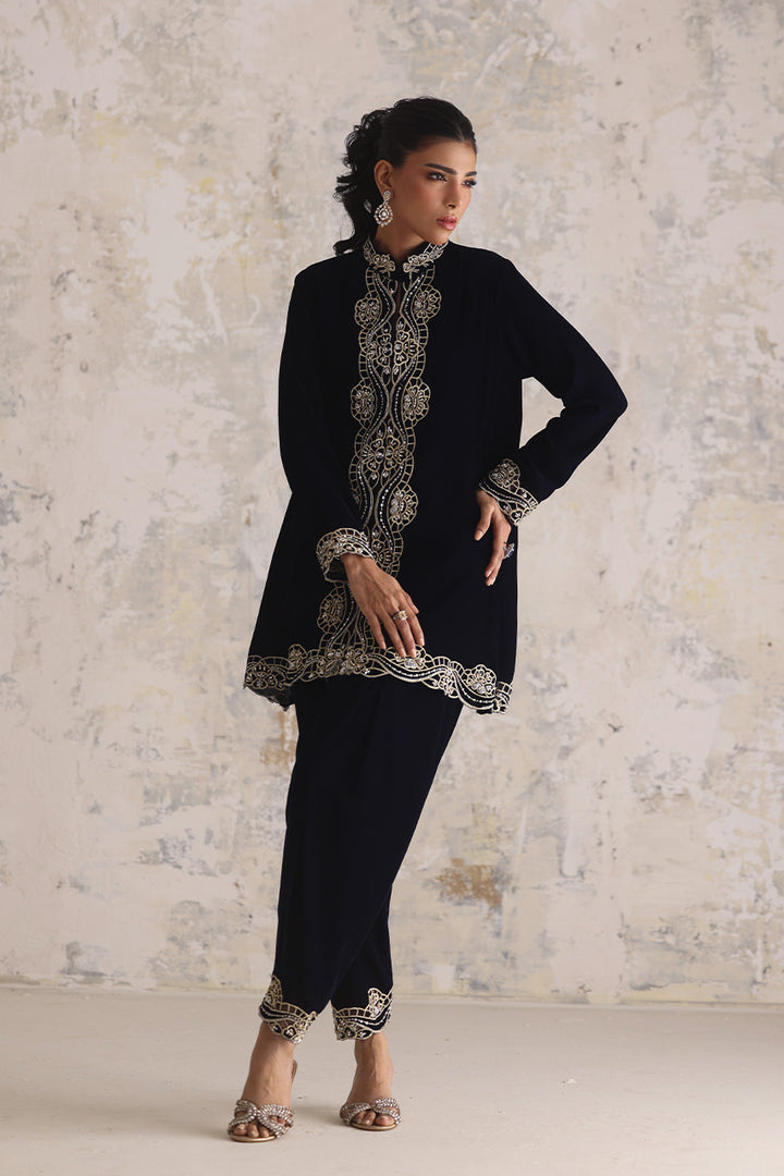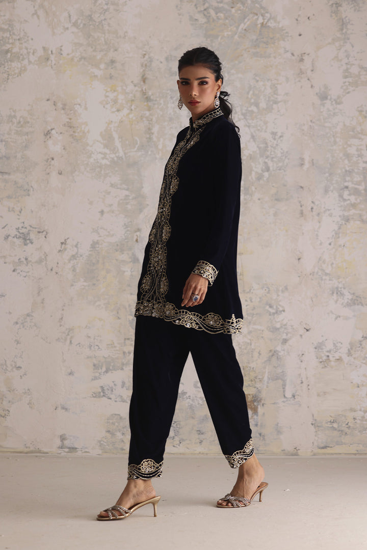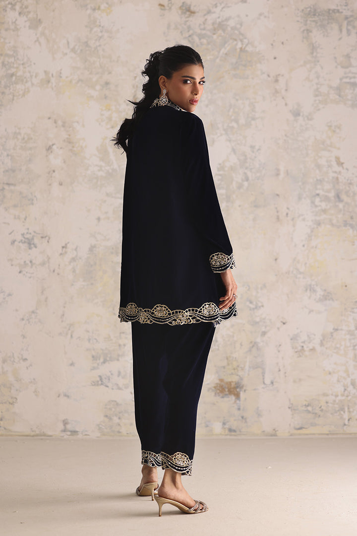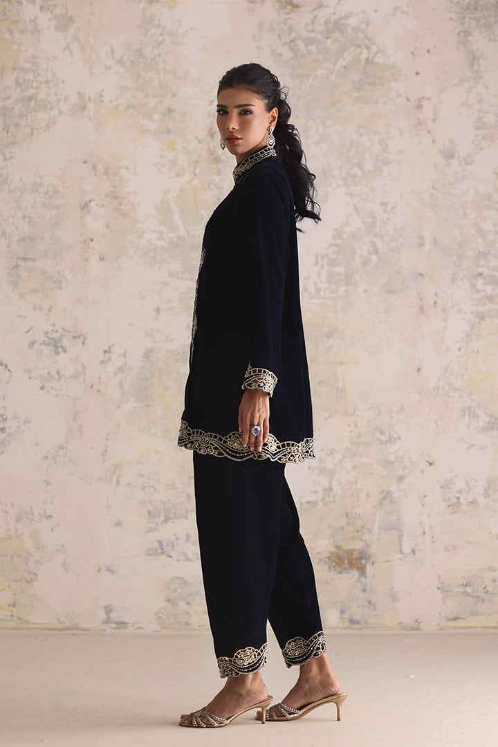 A deep navy velvet canvas becomes the ground for exquisite craft. From the ornate collar, floral vines trail downward in soft gold threads, adorned with glistening sequins, crystals, and beads that add depth. The artistry continues along the sleeves and hem, made more intricate with cutwork. The matching velvet shalwar echoes the same cutwork embroidery and handwork along its border, completing the set with cohesion and quiet refinement.